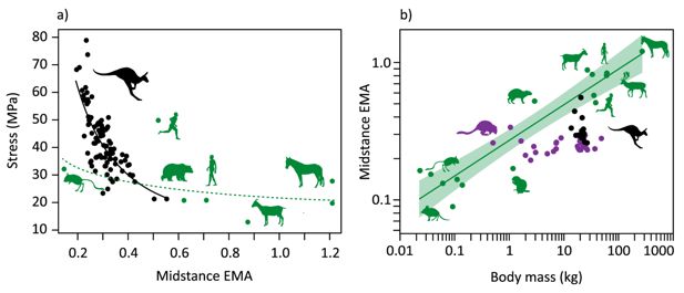 Macropods, in contrast, maintain a crouched posture during hopping. Kram and Dawson, 1998 explored whether kangaroos transitioned to a more extended limb posture with increasing speed as a potential mechanism for their constant metabolic rate, but did not detect a change in EMA at the ankle across speeds from 4.3 to 9.7 ms–1. Furthermore, ankle posture and EMA appears to vary weakly (McGowan et al., 2008) or not at all with body mass in macropods (Bennett and Taylor, 1995; Snelling et al., 2017). As a consequence, stress would be expected to increase with both hopping speed and body mass. Large tendon stresses are required for rapid strain energy return (strain energy ∝ stress2) (Biewener and Baudinette, 1995). Given that tendon recoil plays a pivotal role in hopping gaits, it is perhaps unsurprising that tendon stress approaches the safe limit in larger kangaroos. The ankle extensor tendons in a moderately sized male red kangaroo (46.1 kg) operate with safety factors near two even at slow hopping speeds (3.9 ms–1) (Kram and Dawson, 1998), far lower than the typical safety factor of four to eight for mammalian tendons (Ker et al., 1988). Tendon stresses are also unusually large in smaller kangaroos. Juvenile and adult western grey kangaroos, ranging in mass from 5.8 to 70.5 kg, all hop with gastrocnemius and plantaris tendon safety factors less than two (Snelling et al., 2017). Large tendon stresses may not only be a natural consequence of their crouched posture and tendon morphology, but also be adaptively selected. Considering this, kangaroos may adjust their posture to increase tendon stress and its associated elastic energy return. If so, there would likely be systematic variation in kangaroo posture with speed and mass which is yet to be fully explored.
