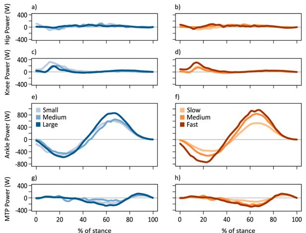 Average time-varying joint powers for the hip (a, b), knee (c, d), ankle (e, f), and MTP (g, h) displayed for kangaroos grouped by body mass (a, c, e, g) and speed (b, d, f, h). Power in all panels is set to the same scale. Body mass subsets: small 17.6±2.96 kg, medium 21.5±0.74 kg, large 24.0±1.46 kg. Speed subsets: slow 2.52±0.25 ms–1, medium 3.11±0.16 ms–1, fast 3.79±0.27 ms–1.