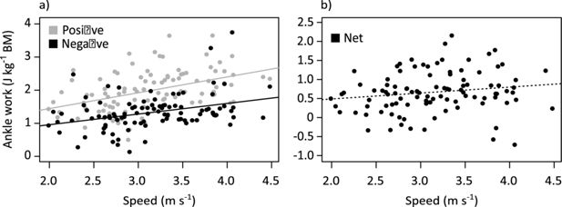 Variation with speed of (a) positive and negative ankle work, and (b) net ankle work per hop.