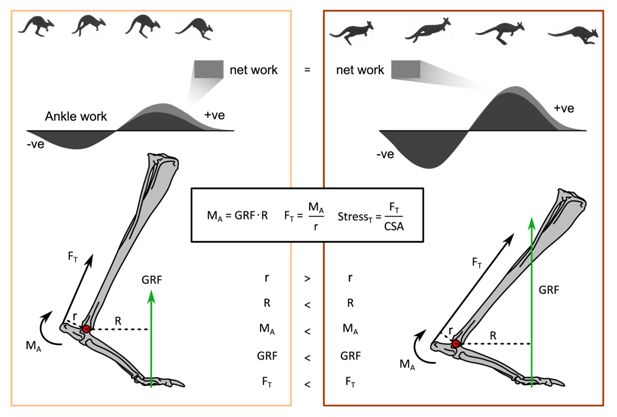 Forces are not to scale and joint angles are exaggerated for illustrative clarity. A slow hop (left panel) compared to a fast hop (right panel). The increase in ground reaction force (GRF) with speed, while a more crouched posture changes the muscle moment arm, r, and external moment arm, R, which allows the ankle to do more negative work (storing elastic potential energy in the tendons due to greater tendon stresses), without increasing net work, and thereby metabolic cost. Ankle moment was calculated by OpenSim and includes inertial terms.