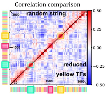 Heatmap comparing activity correlations of TUs in the random string under normal conditions (top half) and with reduced yellow-TF concentration (bottom half).