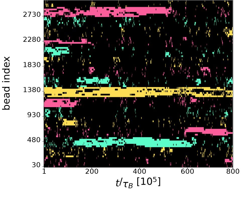 The intuition of the Referee is indeed correct. The finite number of TFs leads to competition among TUs of the same colour, resulting in anticorrelation:when a group of six nearby TUs of a given colour is active, other, more distant TUs of the same colour are not transcribing due to the lack of available TFs. As the Referee suggested,this phenomenon is visible in the kymograph showing TU activity. In Author response image 2, it can be observed that typically there is a single TU cluster for each of the three colours (yellow, green, and red). These clusters can be long-lived (e.g., the yellow cluster at the center of the kymograph) or may destroy during the simulation (e.g., the red cluster at the top of the kymograph, which dissolves at t ∼ 600 × 105 τB). In the latter case, TFs of the corresponding colour are released into the system and can bind to a different location, forming a new cluster (as seen with the red cluster forming at the bottom of the kymograph for t > 600 × 105 τB). This point is further discussed at the point 2.30 of this Reply where additional graphical material is provided.