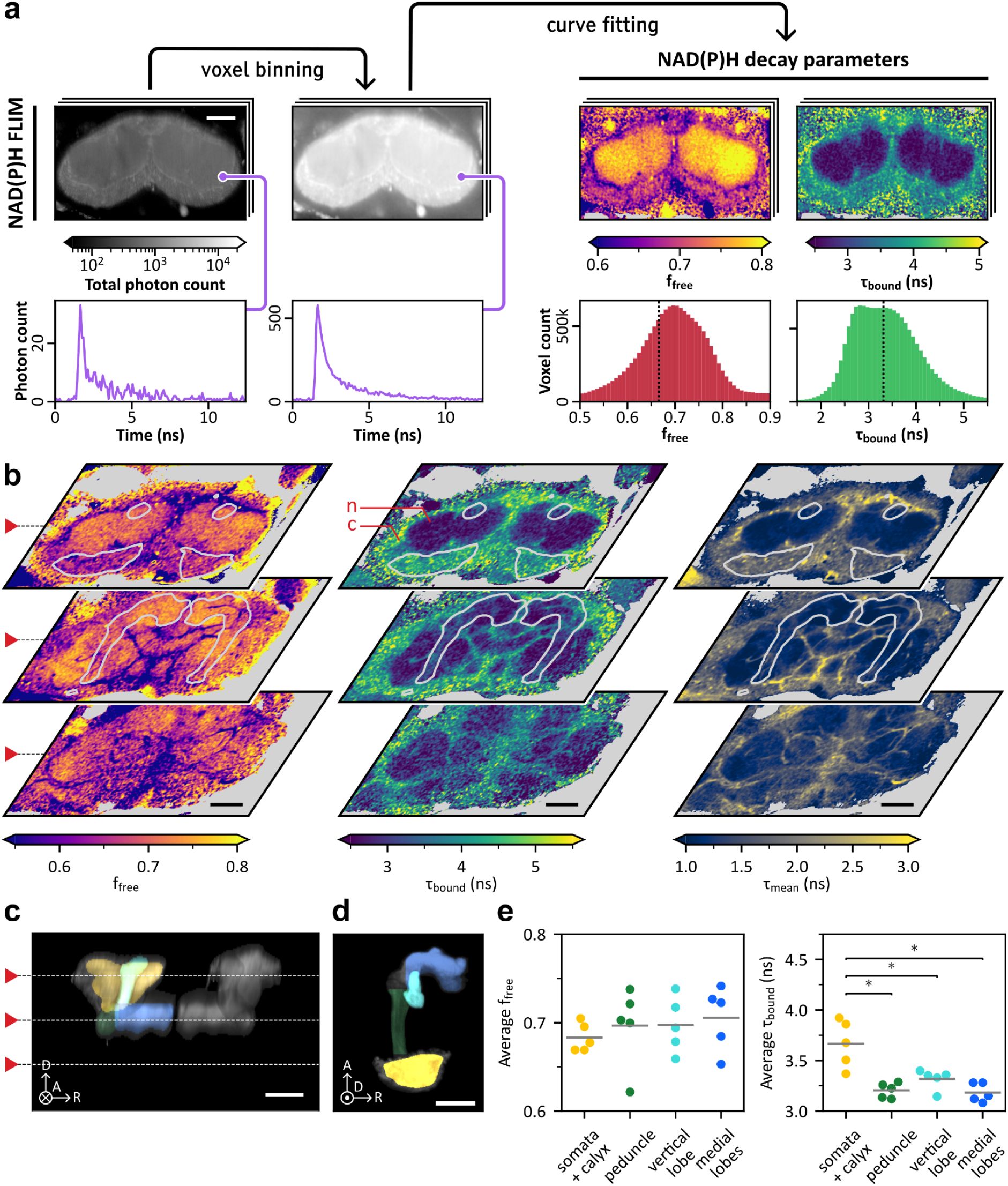 For this novel application of FLIM, we began by mapping the metabolic landscape across the entire Drosophila central brain, with a particular focus on the mushroom bodies (MBs). We conducted in vivo two-photon imaging of NAD(P)H FLIM over the entire central brain in flies expressing a DsRed cytosolic marker in MB neurons (MB-DsRed; Dataset 1 in Methods). Multi-exponential fitting and phasor analysis constitute the main approaches for NAD(P)H FLIM decay characterization (Digma et al., 2008; Stringari et al., 2011; Kolenc and Quinn, 2019; Schaefer et al., 2019; Datta et al., 2020). The former was chosen to automatically extract quantitative metabolic indicators. Given the novelty of the application, we opted for a simple and well-grounded approach to modeling NAD(P)H decays: the bi-exponential model (Kolenc and Quinn, 2019; Schaefer et al., 2019). The decay curves were spatially binned to enhance the signal-to-noise ratio (Figure 1a). A bi-exponential model was fitted to each decay using maximum-likelihood estimation (Sup. Figure 1), generating local estimates of the free NAD(P)H fraction – ffree – and the protein-bound NAD(P)H lifetime – τbound – across the central brain, for each fly. The weighted mean lifetime – τmean – was subsequently computed from these estimates.