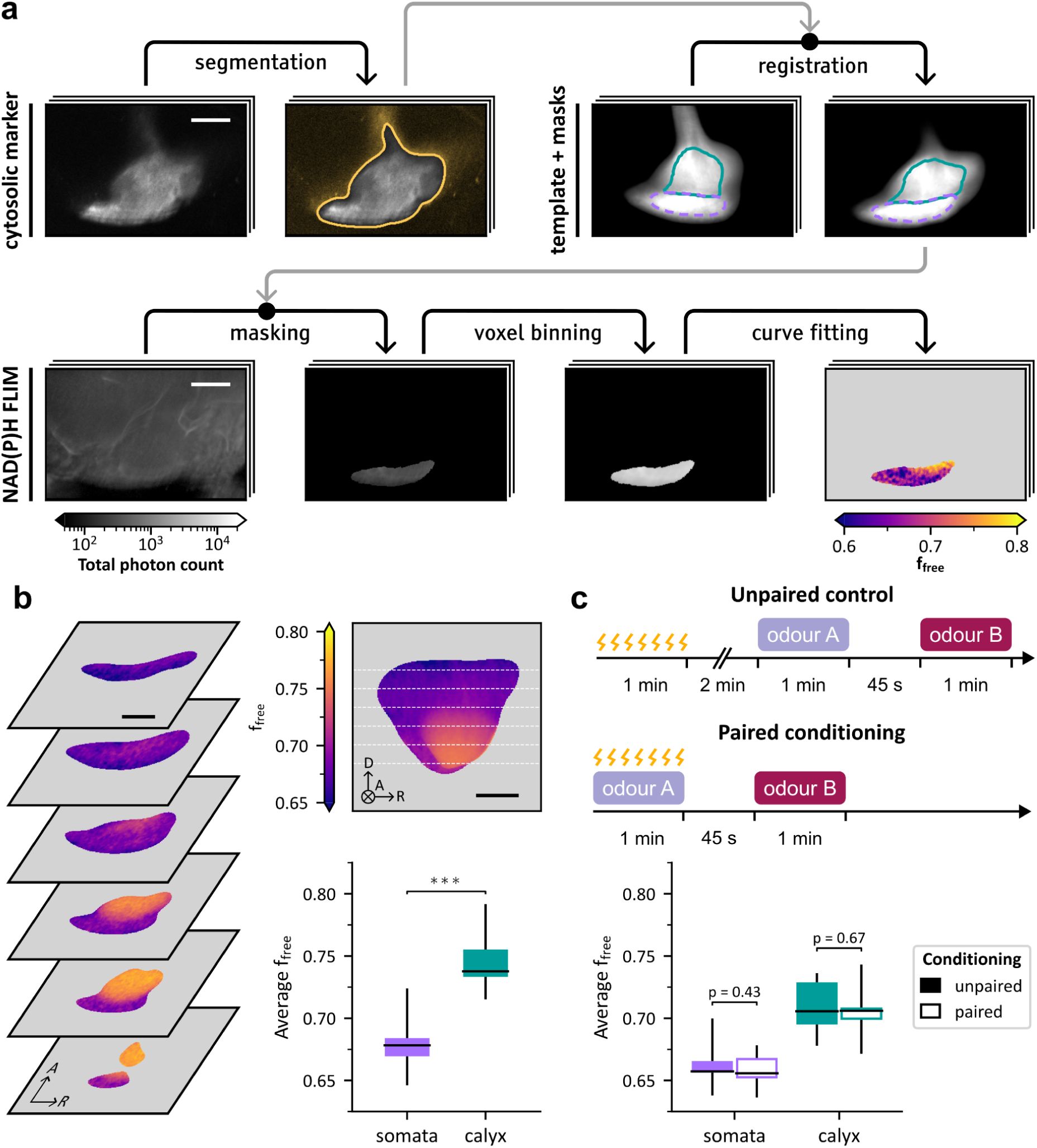 Scale bars: 25 µm. (a) Illustration of the main steps of the computation of the metabolic profile in the KC somata region. The fluorescence intensity of the KC-specific cytosolic marker MB-DsRed was simultaneously recorded with the NAD(P)H FLIM image. The marker image was segmented using thresholding to isolate the MB. Next, we used a MB template with previously defined masks delineating the KC somata region (purple) and the calyx (turquoise). This template was registered to the segmented marker image. The registered masks could be used to isolate the target area (the somata region in this illustration) in the FLIM image. The masked FLIM image was spatially binned using a disk-shaped kernel (see Methods) and the resulting decays were fitted to obtain ffree and τbound values in the target area. Each step is illustrated by a single horizontal section of the example 3D image. (b) Left: Horizontal sections of the average spatial distribution of ffree in the somata area and calyx in naive flies. The average distribution was obtained by computing maps of ffree in the posterior MB region, registering them to the MB template based on the corresponding MB-Dsred images and averaging the results. Axes indicate anterior (A), dorsal (D) and right (R) anatomical orientations. Top right: Average of ffree across all transverse sections of the average spatial distribution, with white dashed lines indicating the depth of the horizontal sections. The circled cross indicates the direction pointing away from the viewer. Bottom right: Within-subject averages of ffree in the somata and calyx regions. ffree values in the somata region (n = 17, µ = 0.682 ± 0.021) were significantly lower than in the calyx (n = 17, µ = 0.746 ± 0.023; paired samples Student’s t-test, t16 = 7.9, p = 6.1·10-7). (c) Top: Schematic representation of the aversive conditioning protocol. Control flies underwent unpaired training, receiving electric shocks, followed by sequential exposure to odors A and B after a 2-minute break. Conditioned flies underwent paired conditioning, receiving electric shocks while exposed to odor A, followed by exposure to odor B. Bottom: Within-subject averages of ffree in the somata and calyx regions for conditioned flies. In the somata region, ffree values for the flies subjected to unpaired stimuli (n = 15, µ = 0.662 ± 0.016) were not significantly different than for the ones subjected to paired conditioning (n = 16, µ = 0.658 ± 0.013; Student’s t-test, t29 = 0.8, p = 0.43). In the calyx, ffree values for the flies subjected to unpaired stimuli (n = 15, µ = 0.709 ± 0.020) were not significantly different than for the ones subjected to paired conditioning (n = 16, µ = 0.706 ± 0.017; Student’s t-test, t29 = 0.4, p = 0.67).