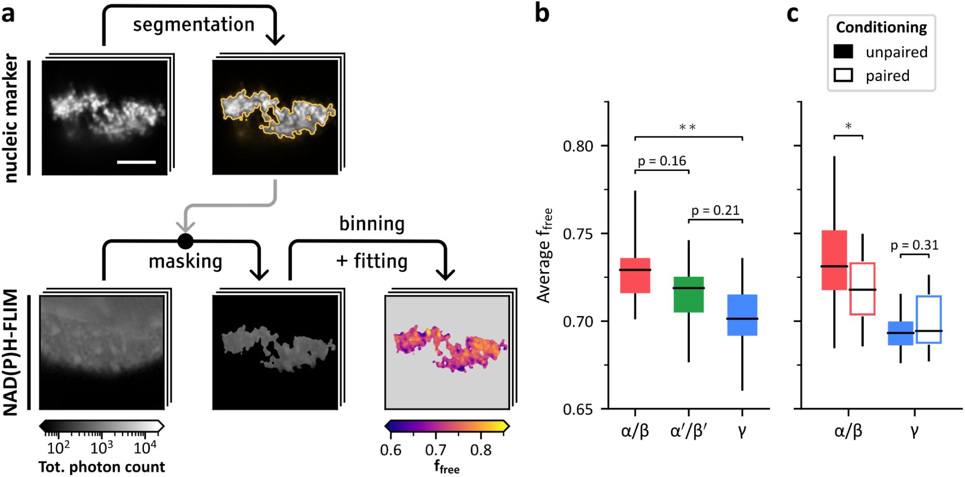 (a) Illustration of the main steps of the computation of the metabolic profile around the somata of a given KC subtype. Standard fluorescence intensity image of the subtype-specific nuclear marker was simultaneously recorded with the NAD(P)H FLIM. The marker image was thresholded to remove background noise and the resulting segmentation was used to mask the FLIM image. The masked FLIM image was spatially binned using a disk-shaped kernel (see Methods) and fitted to obtain ffree values in the target area. Each step is illustrated by a single horizontal section of the example 3D image. Scale bar: 25 µm. (b) Within-subject averages of ffree near the somata of α/β, α’/β’ and γ KCs show significant variations (one-way ANOVA, F2,40 = 7.1, p = 2.4·10-3). ffree is significantly higher near α/β neurons (n = 13, µ = 0.730 ± 0.019) than near γ neurons (n = 15, µ = 0.701 ± 0.022; Student’s t-test, t26 = 3.6, Bonferroni-adjusted p = 3.7·10-3). The values of ffree for α’/β’ neurons (n = 15, µ = 0.715 ± 0.018) were not significantly different from those near α/β (Student’s t-test, t26 = 2.0, Bonferroni-adjusted p = 0.16) or γ neurons (Student’s t-test, t28 = 1.9, Bonferroni-adjusted p = 0.21). (c) Within-subject averages of ffree near the somata of α/β and γ KCs after odor conditioning. Near α/β somata, ffree is significantly lower after paired conditioning (n = 19, µ = 0.718 ± 0.020) compared to the control condition (n = 18, µ = 0.734 ± 0.025; Student’s t-test, t35 = 2.0, p = 4.98·10-2). No statistically significant difference was observed near γ somata between conditioned (n = 12, µ = 0.700 ± 0.017) and control flies (n = 11, µ = 0.693 ± 0.011; Student’s t-test, t21 = 1.0, p = 0.31).