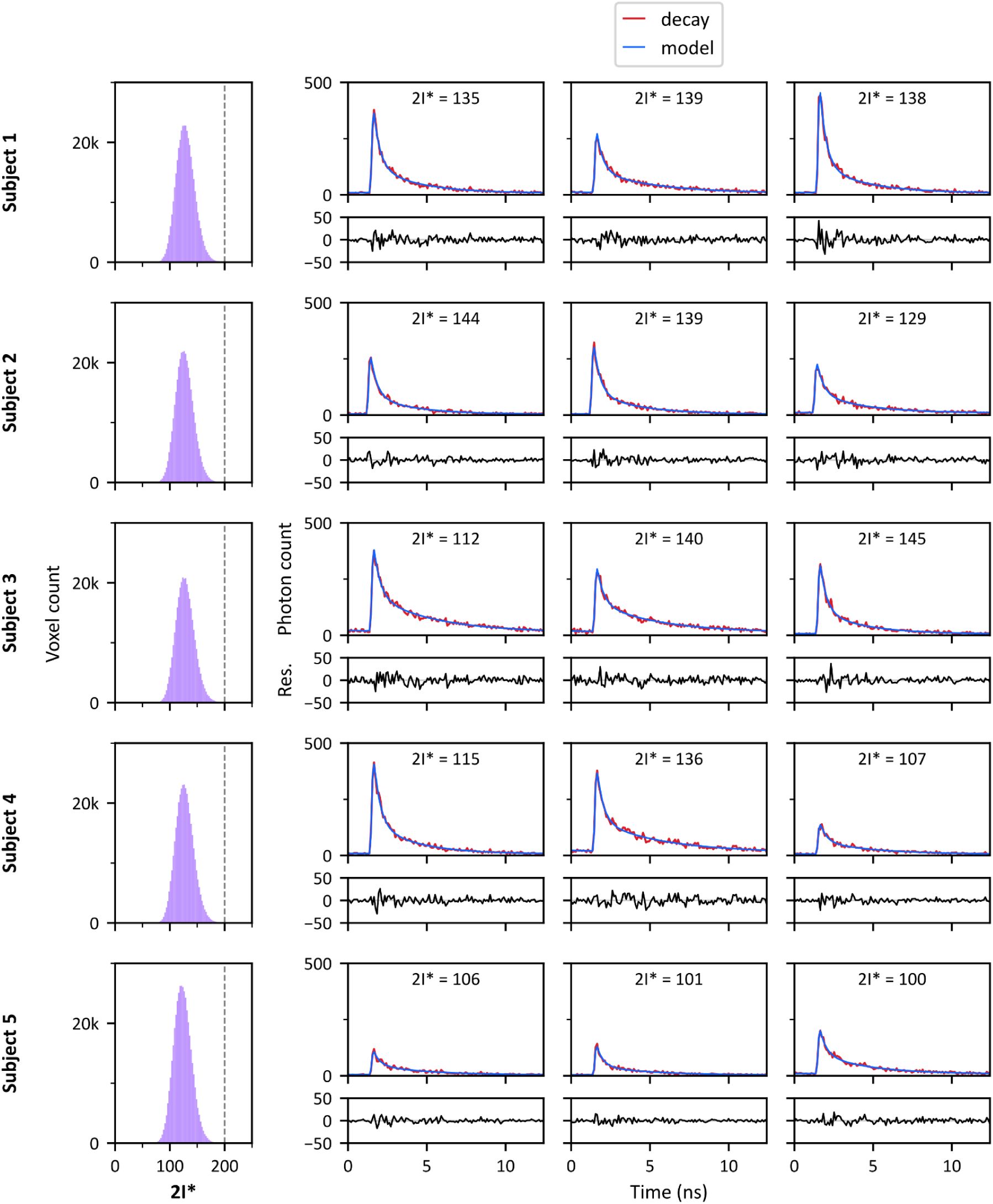 This fitting process was implemented using the Nelder-Mead algorithm (Gao and Han, 2012). Each curve fitting was repeated 5 times, using initialization parameters uniformly sampled from empirically defined ranges. The parameter estimation having returned the lowest 2I* value was selected. Voxels with final 2I* values exceeding the empirically defined threshold of 200 were systematically excluded from further analysis (Sup. Figure 1).