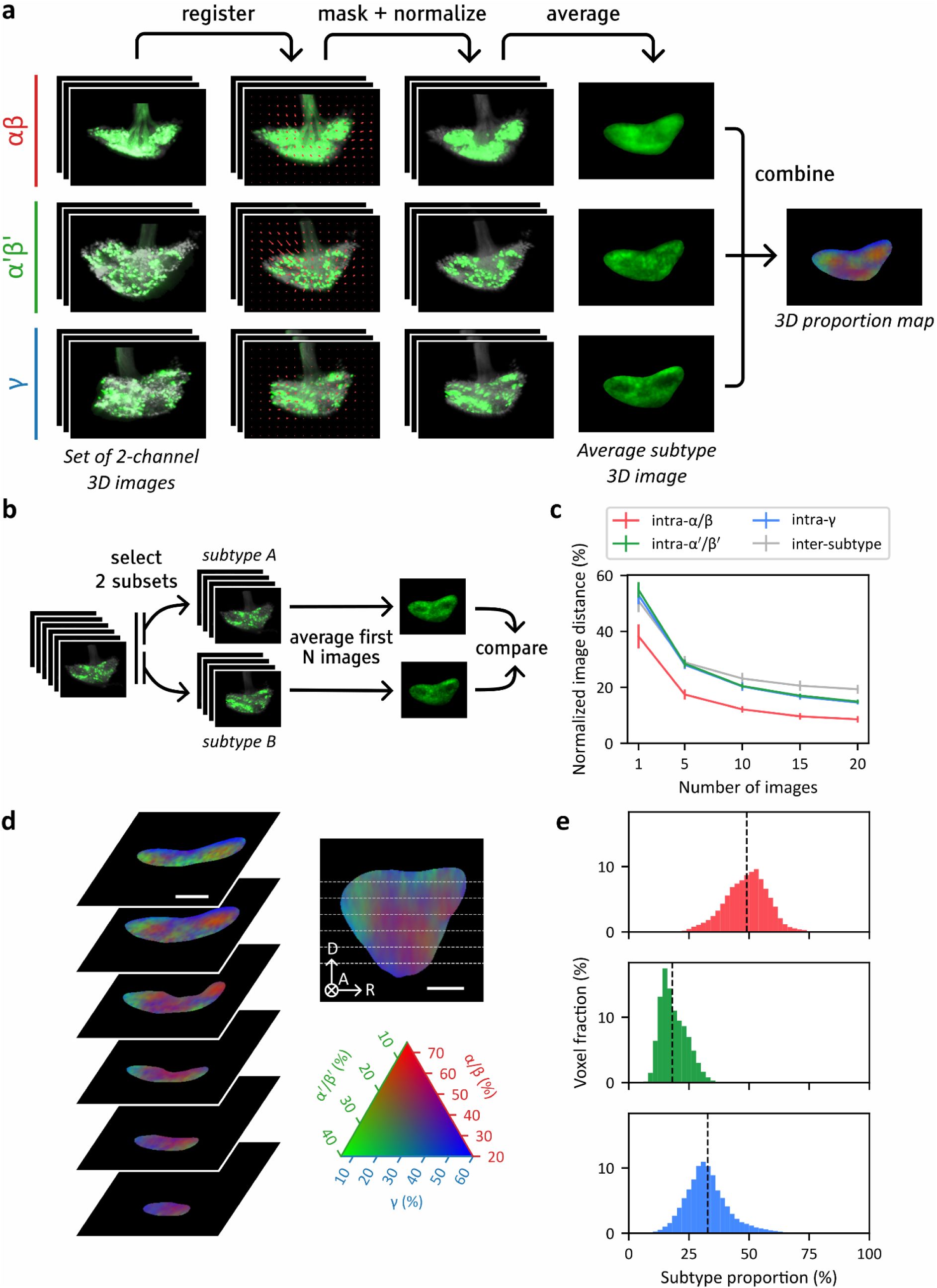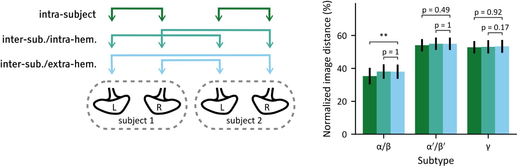 We initially attempted to separate subtype contributions within images through a mapping approach. To this end, we computed the average spatial distribution of each of these subtypes within the somata region of the template image (Sup. Figure 10a). While anatomical maps of the MB neuropil have shown that the neurites of different KC subtypes form distinct bundles (Aso et al., 2014; Li et al., 2020), the stereotypy of KC somata distribution remained largely unexplored. Our analysis revealed that these distributions were spatially non-uniform and reproducible from one group of flies to another (see Supplementary information and Sup. Figure 10bc). Comparisons of pairs of images from identical or different hemispheres revealed an absence of lateralization of the spatial distribution of the neuronal subtypes (see Supplementary information and Sup. Figure 11). However, the degree of overlap between the average subtype distributions was high (Sup. Figure 10de), suggesting important inter-individual variations and making effective separation through segmentation masks impossible.