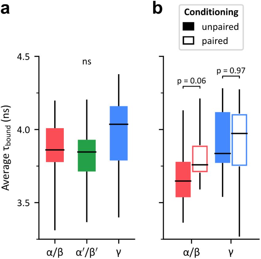 After establishing the basal metabolic profiles of KC subtypes, we sought to measure the influence of memory formation on specific subtypes. We imaged the MB cortical region in conditioned flies expressing subtype-specific nuclear markers (Dataset 8 and Dataset 9 in Methods). We focused on α/β and γ neurons, which have been reported to support the formation of MTM and STM, respectively, following a single training cycle. Our analysis showed that flies exposed to paired training exhibited significantly lower ffree values compared to controls around α/β somata (Figure 3c). In contrast, the average ffree value in γ somata appeared unaffected by the type of conditioning. The effect of paired conditioning on τbound around α/β somata was noticeable but not statistically significant (Sup. Figure 12b).