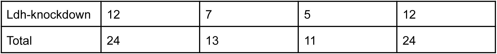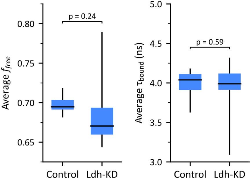 Contrarily from previously observed regional differences, KC subtypes differed on ffree but not on τbound. This suggests, in line with the established interpretation of ffree, that the basal metabolism of α/β neurons rely more heavily on glycolysis relative to OXPHOS than that of γ neurons. We conducted an initial investigation to determine whether the lower ffree values observed in γ neurons could be attributed to a higher reliance on lactate-to-pyruvate conversion catalyzed by lactate dehydrogenase (Ldh) rather than pyruvate production by glycolysis, as Ldh was recently shown to be preferentially expressed in γ KCs as compared to other KC subtypes (Raun et al., 2023). However, we found no significant differences in ffree between Ldh-knockdown flies and controls (Dataset 7 in Methods and Sup. Figure 13).