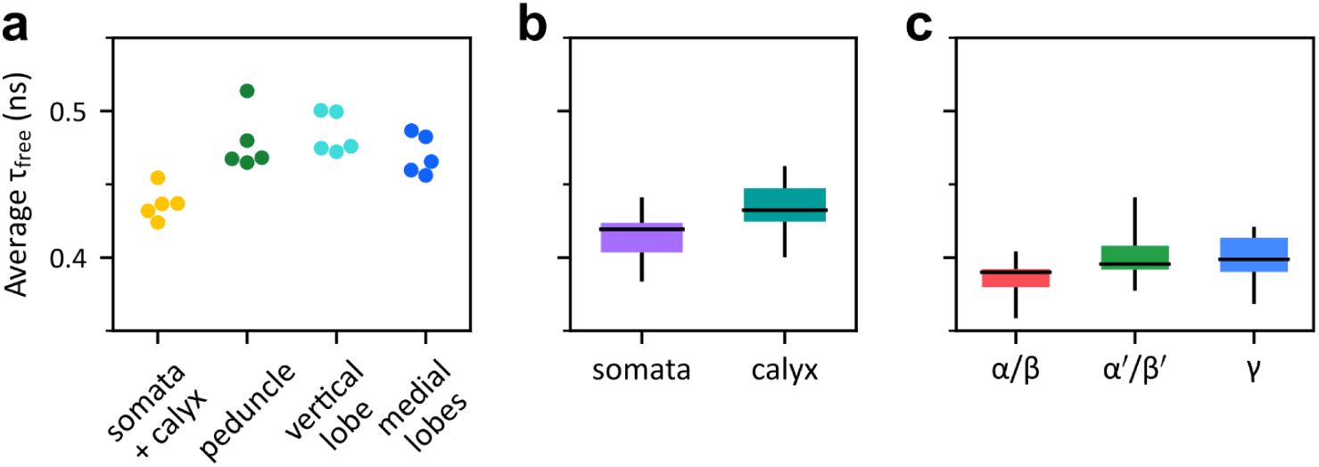 On a broad scale, our findings revealed the distinct metabolic profiles of ensheathing glial layers, cortical areas and neuropil regions, with τbound being particularly discriminative of the neuropil and cortex. At the MB level, differences between KC somata and calyx regions were observed in both τbound and ffree. At a finer scale, significant basal and memory-induced differences were detected in ffree among KC subtypes, whereas changes in τbound remained limited. These patterns suggest that tissue-level differences are primarily reflected by τbound, whereas subtype-specific variations among KCs are predominantly captured by ffree.