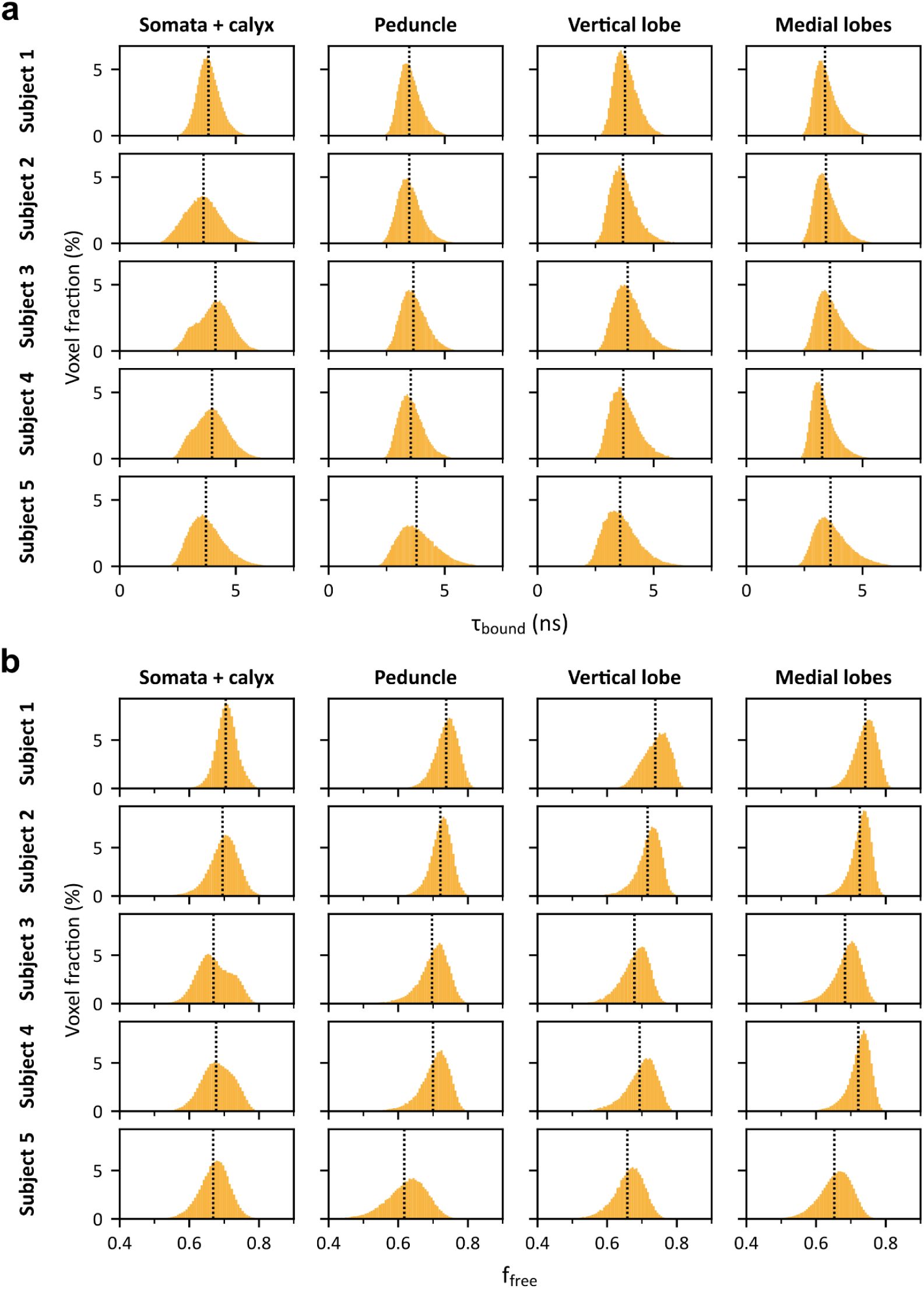 Registration was further used to project decay parameter images to the template space, enabling the generation of an average map of ffree and τbound in the cortical region and calyx (Figure 2b and Sup. Figure 6a) while minimizing the impact of inter-individual anatomical variations. This map was obtained by pooling left and mirrored right hemisphere images, after confirming that there was no hemisphere-specific spatial distribution of ffree (see Supplementary information and Sup. Figure 7). This average map highlighted that ffree was consistently higher in the calyx neuropil than in the cortical region of the MB.