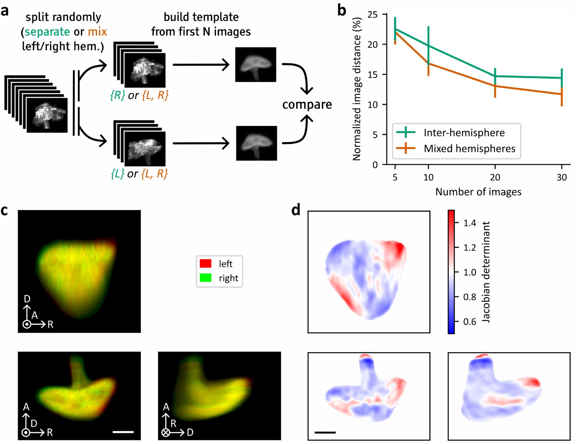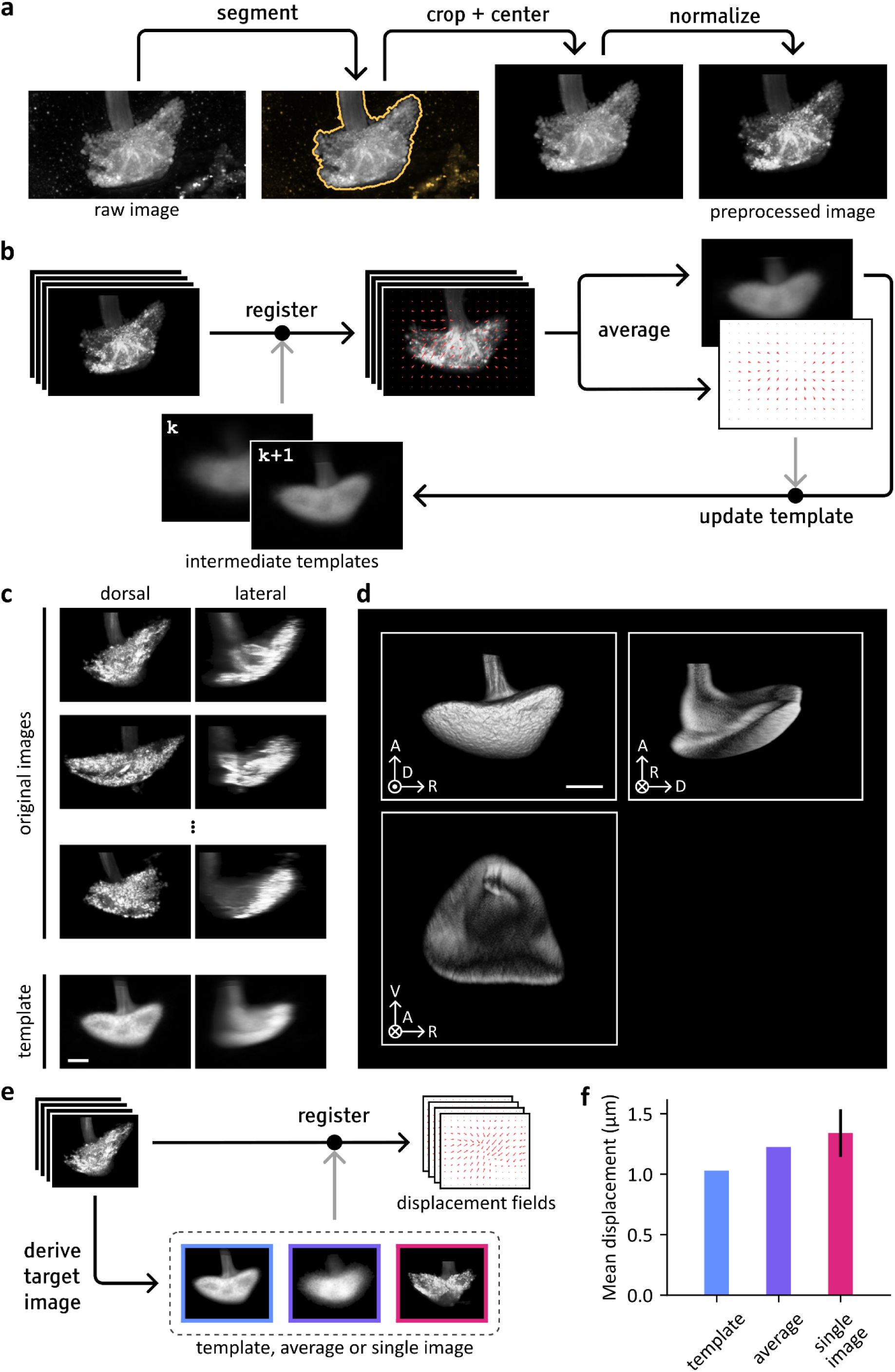 The template was subsequently constructed from the preprocessed images using the symmetric group-wise normalization algorithm (Avants et al., 2010). The registration method used in the procedure was defined as a sequence of rigid, affine and diffeomorphic transformations applied to the 3D volumetric images. Symmetric normalization (Avants et al., 2008) was used as the diffeomorphic transformation, with empirically defined parameters of 0.2 for the gradient step, 3 for the update field smoothing and 1 for the displacement field smoothing. The method initializes the template as the mean image and then iteratively updates it to minimize the average displacement required to register the dataset to the template (Sup. Figure 3b). The template image associated with the lowest average displacement after 8 iterations was selected. The template was finally refined by applying thresholding and centering. The final template image is shown in Sup. Figure 3cd.