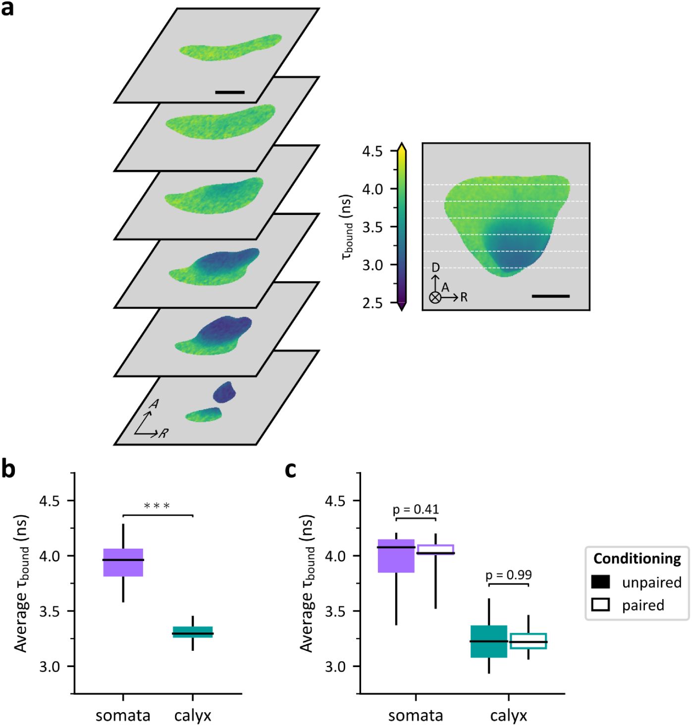 Single-hemisphere maps of ffree were obtained from Dataset 2. Right-side images were mirrored to allow their superposition with left hemisphere images. The MB template was registered to each image. This transformation was applied to the chosen mask (somata or calyx) using nearest-neighbor interpolation. The warped mask was applied to select the region of interest in the FLIM image. Spatial binning and curve fitting was applied to the masked FLIM image, resulting in maps of the decay parameters over the region of interest.