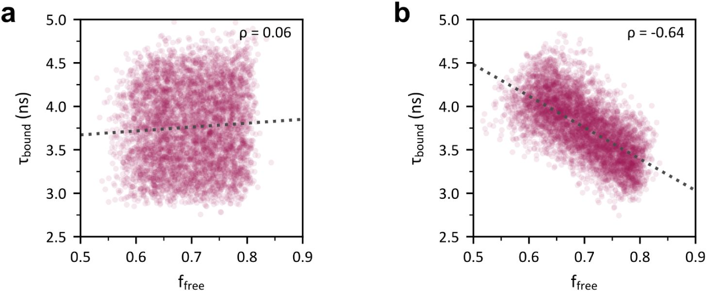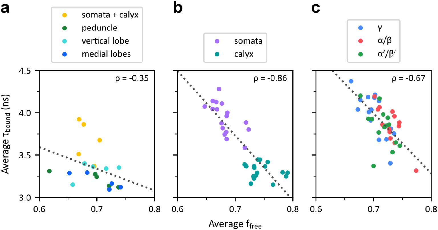 Measures of ffree and τbound were notably anticorrelated in the posterior part of the MB (Sup. Figure 8). The anticorrelation between these parameters can be qualitatively observed in several studies (Bird et al., 2005; Skala et al., 2007; Wetzker and Reinhardt, 2019; Yang et al., 2021). Multi-exponential fitting has been reported to potentially introduce artificial correlations between parameter estimates (Grinvald and Steinberg, 1974; Johnson, 2000). Through simulation, we confirmed that the relationship observed in our data was not an artifact of the fitting process (see Supplementary information and Sup. Figure 9), supporting the hypothesis of its biological origin.