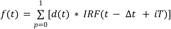 where IRF is the microscope impulse response function, Δt is the temporal shift between the IRF and the measured signal and T is the laser period. The modeled signal at time t takes into account the fluorescence caused by the last laser pulse (term for p = 0) as well as the previous one (term for p = 1), as proposed by (Klemm et al., 2015). (Klemm et al., 2015).