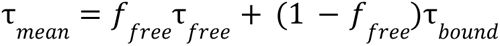 where ffree is the free NAD(P)H fraction, τfreeis the free NAD(P)H lifetime and τbound is the protein-bound NAD(P)H lifetime. The measured decays were fitted with the following function f, which incorporates the theoretical decay and the effects of the measurement process: