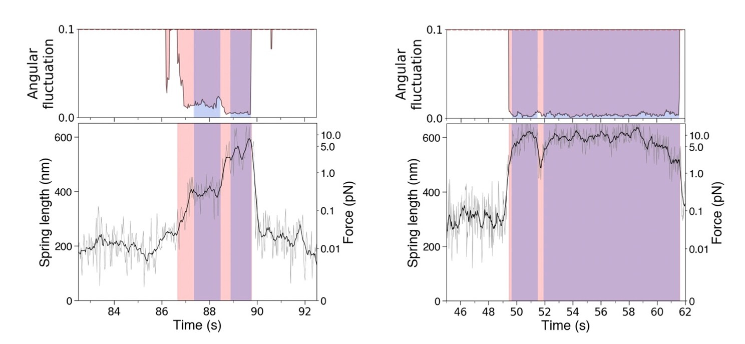 The tethered nanospring method has some weaknesses; it only allows the stall force to be measured in the case that a stall plateau is achieved, and the thermal noise means that individual steps are not apparent. The nanospring does not behave like a Hookean spring - instead linearly increasing force is reported by exponentially smaller extensions of the nanospring under tension. The estimated stall force for Kif1A (3.8 pN) is in line with measurements made using 3 bead optical trapping, but those earlier measurements were not of a stall plateau, but rather of limiting termination (detachment) force, without a stall plateau.