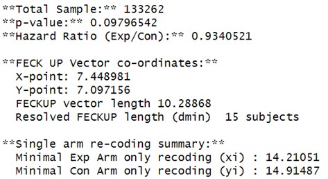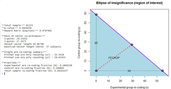 (13) Using the previous code (before downgrading R and loading PlaneGeometry), I recalculated the EOI for Zhang et al. (2022) and found Minimal Experimental Arm only recoding (xi) = 55 and Minimal Control Arm only recoding (yi) = 59-results slightly closer to those reported by the authors. After properly loading PlaneGeometry, I recalculated and obtained for Zhang et al. (2022): Fragility index (dmin) = 57; FECKUP Vector Length = 39.948; Minimal Experimental Arm Recoding (xi) = 54.5436; Minimal Control Arm Recoding (yi) = 58.635.