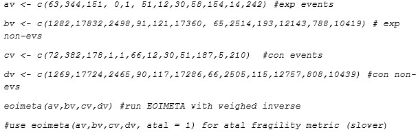 If the reviewer uses the EOIMETA function which employs inverse weighing, then to define each trial we use a vector of events and non-events in each arm. For all the 12 studies, this would be (in R code syntax, or import from github file)