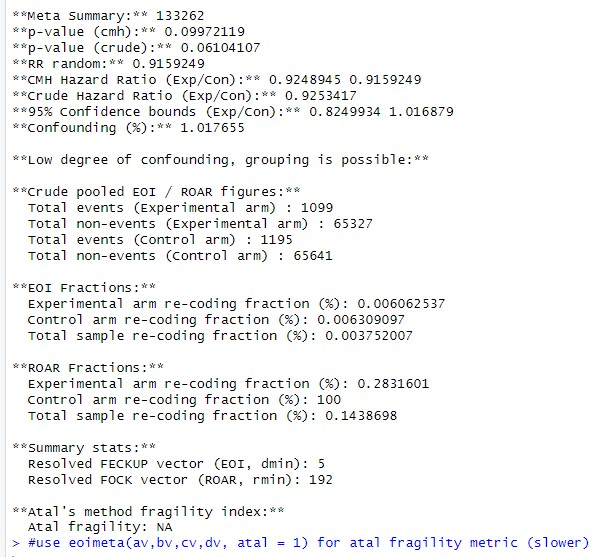 If the reviewer runs a simple pooler analysis with weighed inverse correction turned off, they should return a similar answer as a simple eoifunc call, save the zero count correction difference. But EOIMETA weighs the sample, and is reported in main paper.