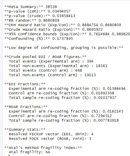 (11a) Replications of EOI fragility: eoicfunc.R (github): - In the code provided on GitHub, an error occurred in the "EllipseFromEquation" function within eoifunc. This was due to the PlaneGeometry package not being available for the latest version of R. I attempted several installation methods (using devtools, remotes, and GitHub, as well as direct installation from a URL). However, after adjusting the code, I was able to run the analyses. For the full cohort, including all 12 studies using the EOI approach, I obtained a Minimal Experimental Arm only recoding (xi) = 14 and a Minimal Control Arm only recoding (yi) = 15, whereas the authors reported that 5 recodings were sufficient. It appears that differences in code versions or functions might have slightly affected the results. After downgrading R and running the eoic function with PlaneGeometry successfully installed, the fragility index for the EOI approach was 15 rather than 5.