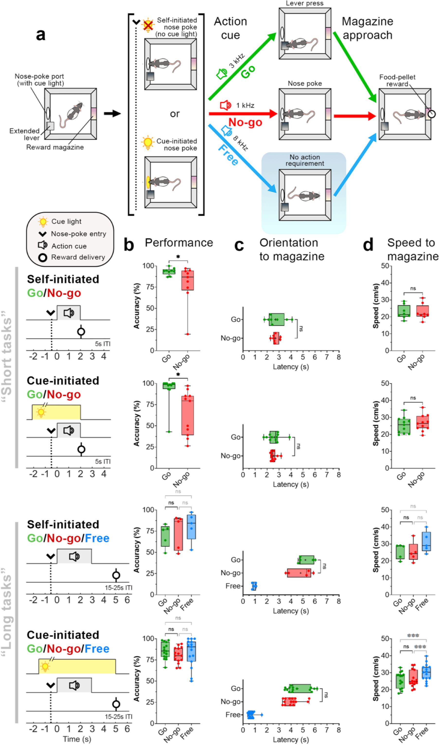 a) Schematic of the Go/No-go (short) behavioral task. Rats initiated trials by entering a nose-poke port (arrow, dotted line), either voluntarily (Self-initiated) or following nose-poke light illumination (Cue-initiated). After staying in the nose-poke port for 0.5s, an auditory stimulus (action cue) instructed rats to either initiate action (lever presses: ‘Go’, green) or remain in the nose-poke port (‘No-go’, red). In the Go/No-go/Free (long) task, an additional action cue was presented that did not require an action for rewards (‘Free’, blue). Following Free cue onset, rats could approach the reward magazine immediately. b) Schematic of task timeline. For all trials, reward-delivery latency (relative to action cue onset) was similar. c) Success rates across Go/No-go task variants. d) Latency to orient toward the reward magazine following action cue-onset. e) Speed of movement toward the reward magazine after orientation. Significance: * p < 0.05, ** p < 0.01, *** p < 0.001, Wilcoxon matched-pairs signed rank or post hoc Dunn’s tests.