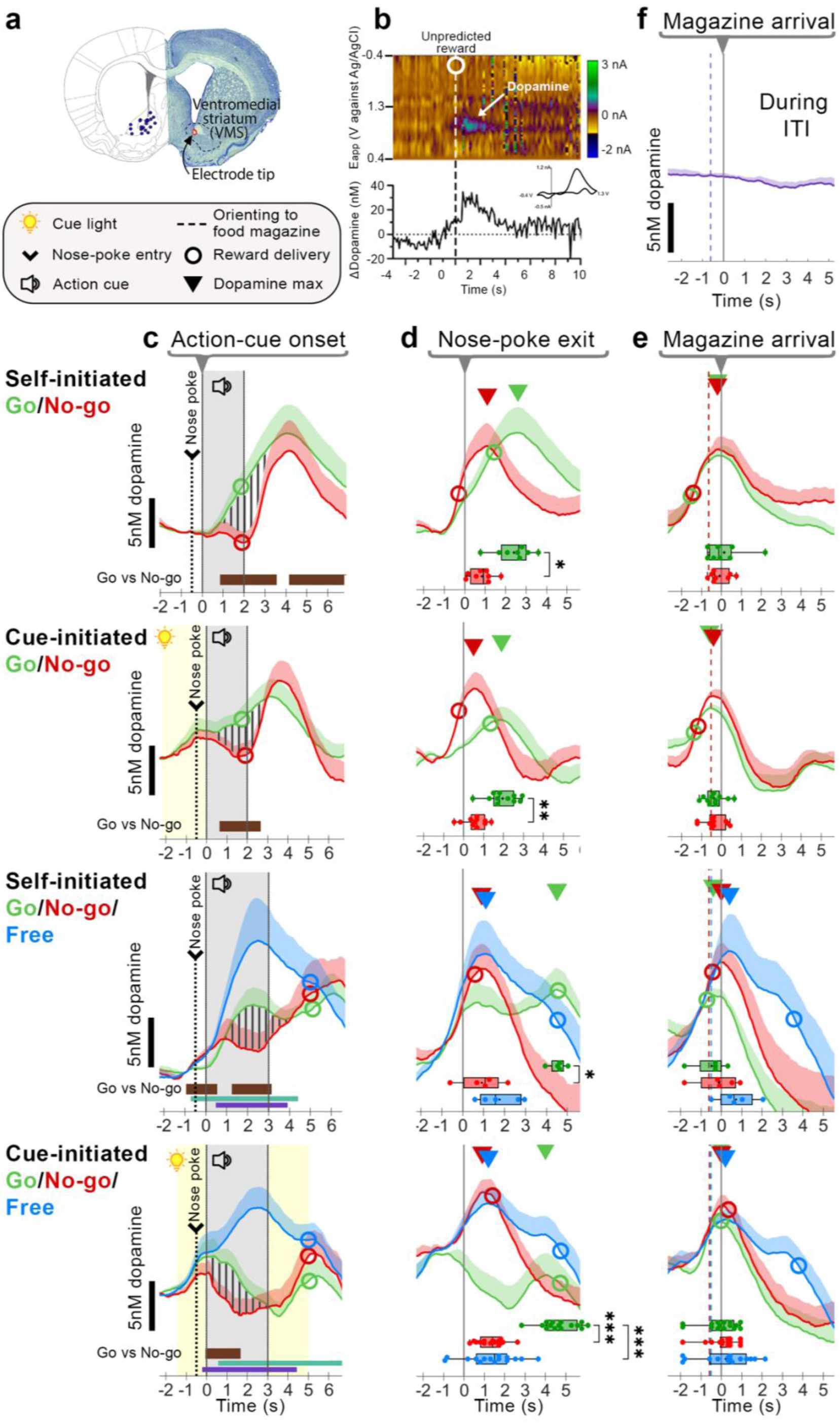 a) Histological verification of electrode placements in VMS (n = 27). b) Representative color plot and corresponding dopamine trace in response to an unpredicted pellet. The dotted line and circle indicate pellet delivery. Inset: Accompanying cyclic voltammogram confirms dopamine detection. c-e) Average dopamine concentration (nM; mean + SEM) for Go (green), No-go (red), and free (blue) trials. Triangles denote the average latency of peak dopamine relative to different alignment points. c) Traces aligned to action-cue onset. Vertical stripes highlight differences in Go vs. No-go dopamine. Horizontal bars indicate significant within-subjects differences between trial types (Brown: Go vs. No-go, Aqua: Free vs. Go, Purple: Free vs. No-go). d) Traces aligned to nose-poke exit; e) magazine arrival. Box plots depict latency of peak dopamine release (± 2s) around magazine arrival per animal. f) Dopamine release during the inter-trial interval (ITI) as rats approached the reward magazine from the opposite wall, aligned to magazine arrival. Boxplot statistical significance: * p < 0.05, ** p < 0.01, *** p < 0.001, Wilcoxon matched-pairs signed rank or post-hoc Dunn’s tests.