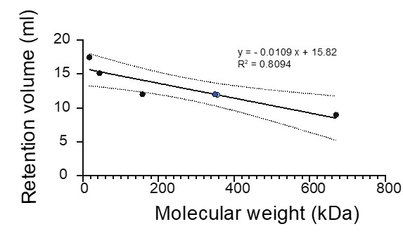 As shown in Figure S1, the stability of TDM is highly dependent on protein and salt conditions. At 150 mM NaCl, SEC reveals a dominant peak eluting between 10.5 and 12 mL, corresponding to an estimated molecular weight of ~170–305 kDa (blue dot, Author response image 1). This fraction was explicitly selected for cryo-EM analysis and yields the larger complex observed in the reconstruction. At lower salt concentrations (50 mM) or higher (>150 mM NaCl), the protein either aggregates or elutes near the void volume (~8 mL).