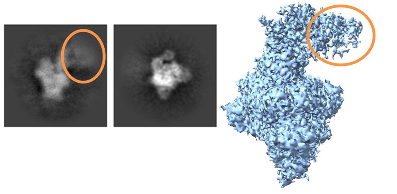 A minor subpopulation (~2%) exhibited increased flexibility in the N-terminal region of the two full-length subunits, but these particles did not form a separate oligomeric class, indicating conformational heterogeneity rather than alternative assembly states (Author response image 2). Together, these data support the 2+2½ architecture as the predominant and stable complex under the conditions used for cryo-EM. Additional techniques, such as iSCAT, would provide complementary information, but are not required to support the conclusions drawn from the SEC and cryo-EM analyses presented here.