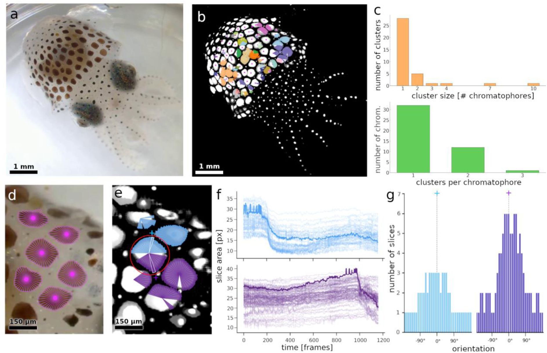 The hummingbird bobtail squid E. berryi was used for initial experimental configuration and setup. This species was chosen for its compact size, large chromatophores, and rapid growth. Video recordings (10-60 min durations) were taken from 14 animals of 1-60 days of age (see Methods). In Fig 1, we analyzed a 30-s video dataset (1080 × 1080 px, 20 frames per second or fps) from a sedated hatchling that exhibited spontaneous chromatophore activity (Fig. 1a). Mild and “noisy” spontaneous activity was critical to enable measurements of motion correlation between chromatophores. Chromatophores were segmented, each divided in polar (radial) slices and the areal variations of each slice across all successive time frames were measured, as developed and described in Ukrow & Renard (2025). Chromatophore slices were then clustered using HDBSCAN (Campello et al., 2013), based on the temporal correlation of their size variations; in Fig. 1b, slices belonging to the same motion cluster (whether it belonged to one or more chromatophores) are represented in the same color. This analysis revealed that clusters were composed of slices that lay both within and across individual chromatophores (Fig. 1c), with some chromatophores contributing to multiple clusters (Fig. 1d-f). Within a cluster, the orientation of each slice tended to align centripetally towards a virtual point located between the contributing chromatophores (Fig. 1g), effectively forming a closed “virtual chromatophore” rather than ring-like patterns. An example is shown in Fig 1e, in which a single chromatophore (red ring) was divided into two adjacent slice clusters: one half was grouped with neighboring chromatophores located above (cyan); the other half with chromatophores located below (purple). Notably, smaller (yellow, less mature) chromatophores in the same region did not deform and therefore did not cluster, despite lying in the same apparent innervation field. These inactive chromatophores proved to be very useful, serving as stable anchors for motion tracking. Whereas E. berryi proved extremely useful to define the important parameters of our analyses and troubleshoot our techniques, this nocturnal species’ camouflaging behavior was very limited and only very moderately interesting. We thus ran our higher-resolution analyses in subsequent experiments, conducted with Sepia officinalis, a diurnal master of camouflage with large numbers and density of chromatophores.