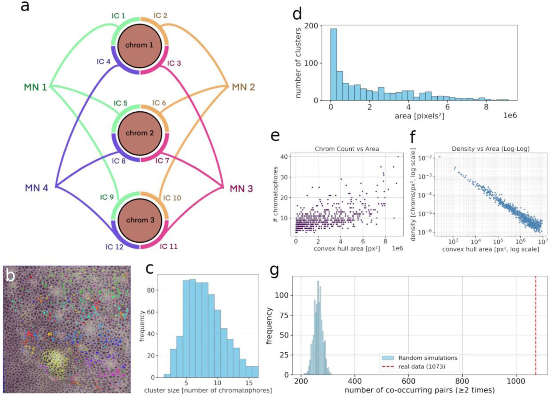 a) Schematic representation of derived chromatophore innervation by motor neurons. Each chromatophore is depicted as a circle, with arcs around them representing independent components identified by ICA, each interpreted as corresponding to the zone of influence of a single motor neuron on that particular chromatophore. One goal of this clustering was to reveal shared chromatophore innervation and thus, motor units. Colors and lines connecting IC arcs indicate that they belong to the same motor unit, highlighting the shared innervation pattern across multiple chromatophores. b) A small number of clusters of size 3 to 5 are mapped back on the original image for visualisation. c) Distribution of cluster size (size in number of IC). d) Distribution of cluster convex hull areas, showing a right-skewed profile with most clusters occupying smaller areas. All values are reported in pixel² (px²); note that the main text reports corresponding measurements in µm² after conversion (10 pixels = 1 µm, thus 1 px² = 0.01 µm²). e) Relationship between chromatophore count and convex hull area for each cluster. f) Chromatophore density (chromatophores per pixel²) as a function of convex hull area, plotted on a log-log scale. The inverse relationship reflects decreasing density in larger clusters. g) Histogram showing the distribution of second-order co-occurrence counts—defined as the number of chromatophore pairs co-occurring in at least two clusters—across 1000 randomised datasets (blue). Randomisations preserved both the number of clusters and the number of memberships per chromatophore. The red dashed line indicates the observed experimental value, significantly higher than expected by chance.