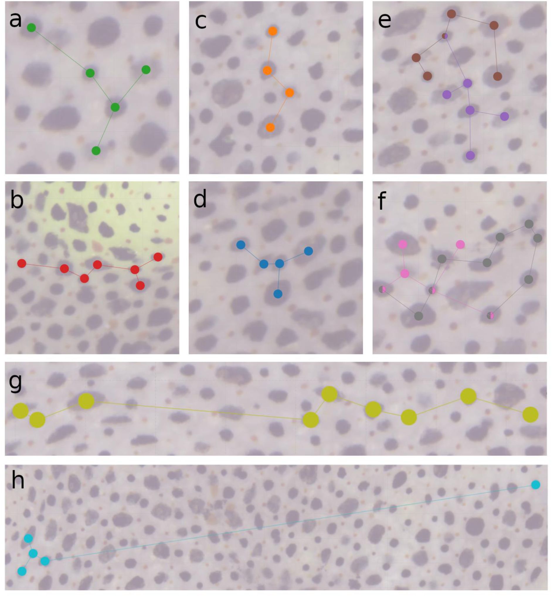 Chromatophores belonging to the same correlated-motion cluster, or putative MU, are shown as colored dots connected by lines. a-d) Compact clusters. e-f) Overlapping clusters with shared chromatophores. g) Elongated cluster with a linear structure. h) Mixed profile featuring a core group of adjacent chromatophores connected to a single, distant chromatophore.