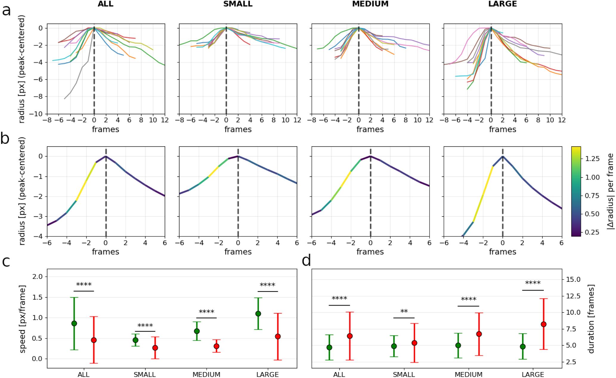 Events are first filtered to remove very small peaks (expansion amplitude ≤ 15% of the observed amplitude range). Remaining events are split by expansion amplitude percentiles: SMALL = lower tail, MEDIUM = central band, LARGE = upper tail. Within each tail band, outliers in either amplitude or speed are removed using Tukey’s IQR rule, and statistics are computed on the remaining events (see Methods). a) Peak-aligned event segments (10 randomly selected events per column) for each group. Traces are shifted to align at the peak (t=0). Same y calibration in the four panels. b) Mean event profile for each size group, where each segment is color-coded by instantaneous size change (|Δradius| for pairs of consecutive frames); LUT at right. Same y calibration in the four panels c) Means ± SDs of chromatophore size change (px/frame) for expansion (green) and contraction (red) phases. Statistical significance evaluated using paired t-tests between expansion and contraction phases (n = 2157 event pairs). Asterisks indicate significant paired differences p < 0.05 (*), p < 0.01 (**), p < 0.001 (***), and p < 0.0001 (****). d) Same as in c but for event duration (in frames).