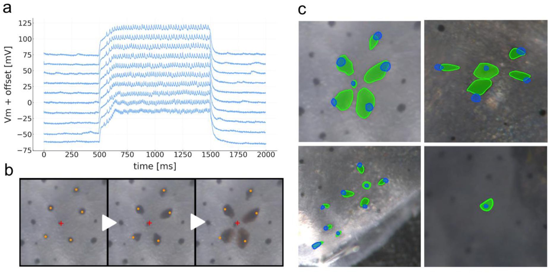a) “Patch-clamp recordings from a chromatophore-lobe motor neuron. Ten consecutive sweeps are shown, vertically offset for clarity and downsampled x4 (from 100 to 25 kHz). b) Sequence of video stills showing chromatophore expansion elicited by stimulation of the same motor neuron as in a. In orange, chromatophore epicenters, defined as the center of mass at the frame where the chromatophore is in its most contracted state. Each chromatophore expands anisotropically toward a common center of innervation (approximated as a red cross). c) Composite images showing chromatophore outlines before (blue) and during stimulation (green). The first three examples display anisotropic expansion across several chromatophores within a single motor unit—the first example is the same motor unit shown in a–b. The last example shows isotropic expansion of a motor unit composed of a single chromatophore.