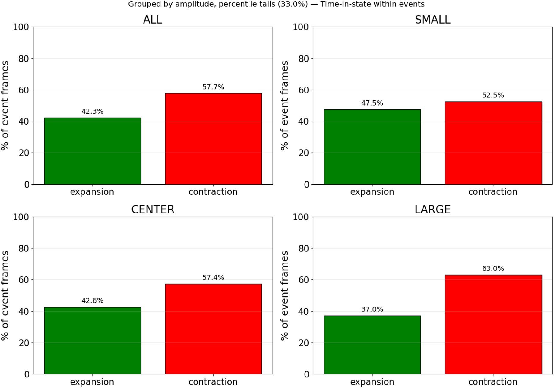 For each amplitude category (SMALL, MEDIUM, LARGE), the proportion of frames spent in the expansion (green) versus contraction (red) phase was computed across all valid events (n = 2157). Percentages were calculated relative to the total duration of each event (expansion + contraction). This analysis corresponds to the same dataset shown in Fig. 5.