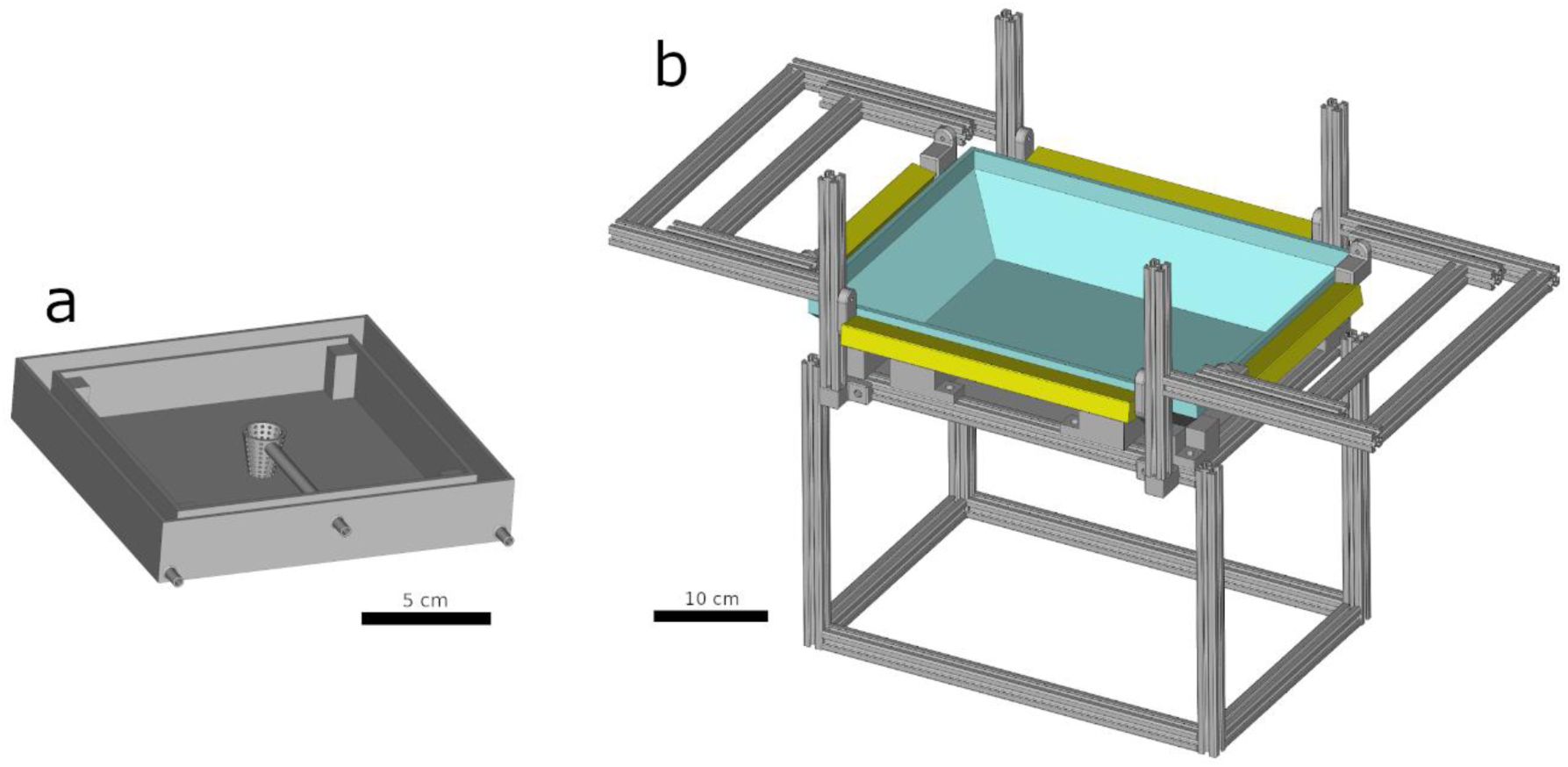 a) Arena for Euprymna berryi hatchlings. b) Rig for Sepia officinalis. Four adjustable LED lamps in yellow. Transparent tank in cyan. Structure in gray.