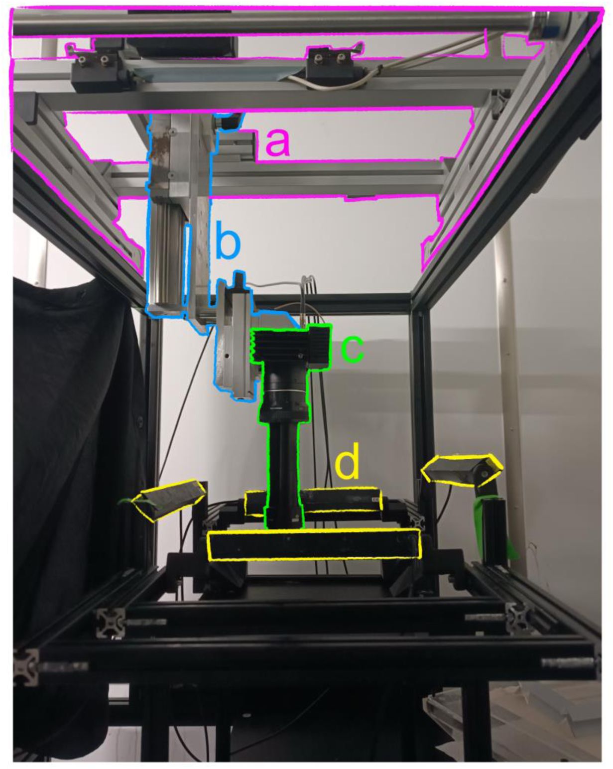 a) Remotely controlled linear rails. b) Z-axis manual translation stage. c) Camera and lens. d) LED lights.