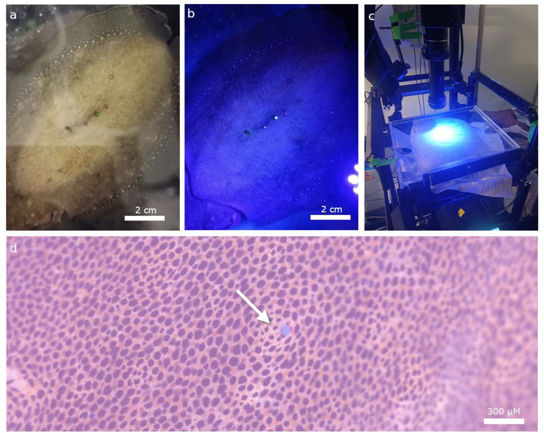 a) Sepia officinalis marked at the center of the mantle with tags of various colors in a row. b) Marked animal under fluorescent light. c) Fluorescent lamp mounted next to the camera on the filming rig. d) Footage captured by the high-resolution camera. Close-up on the blue fluorescent tag indicated by an arrow.