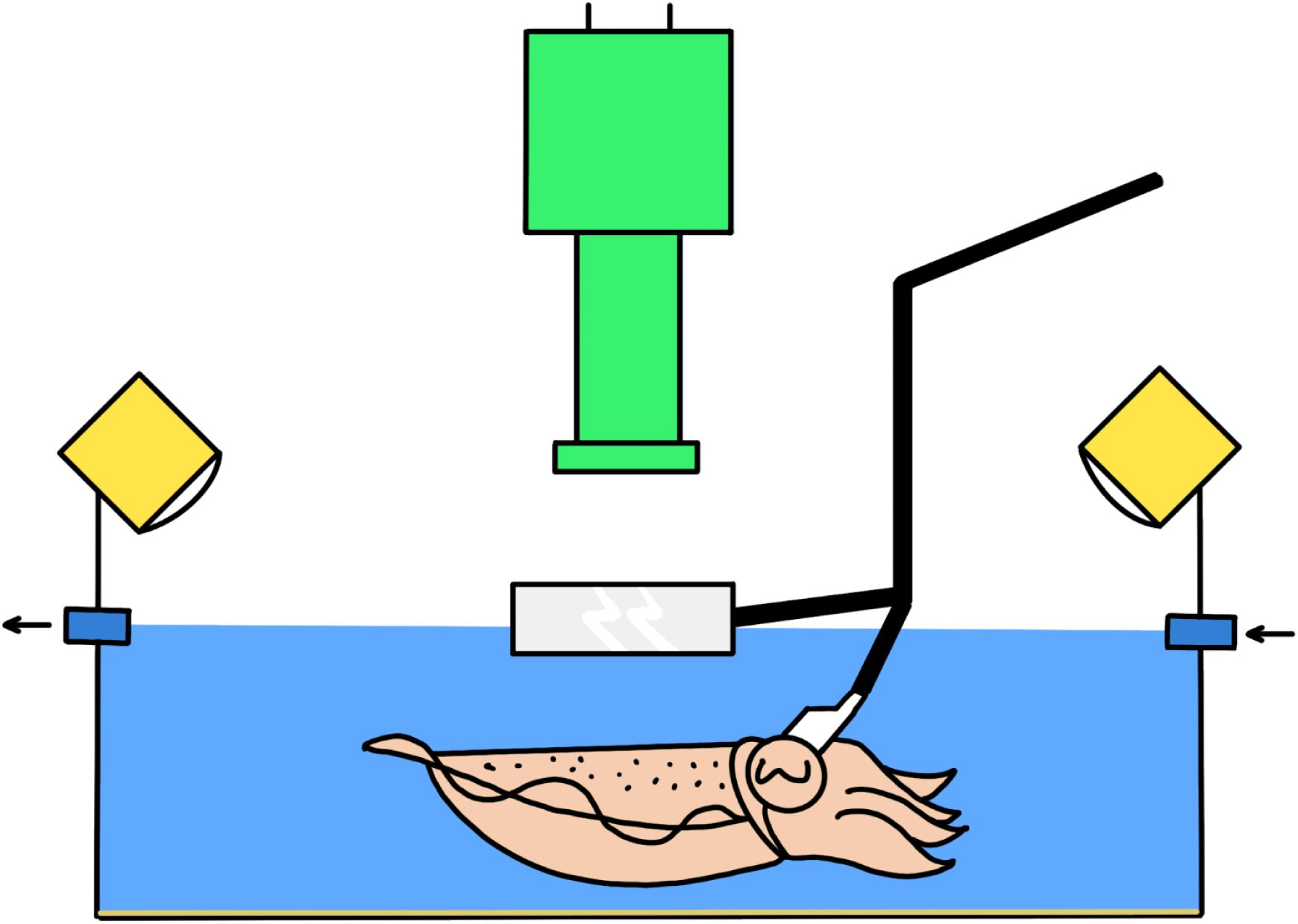 The camera (green) is positioned above the tank, which is filled with artificial seawater (blue). A constant flow of water (indicated by arrows) ensures proper oxygenation. LEDs (yellow) surrounding the tank provide uniform illumination. A bracket (black) supports a thick glass panel (gray) to minimize water distortion during filming. The same bracket also holds a head-fixation mount (white) to stabilize the animal’s head.