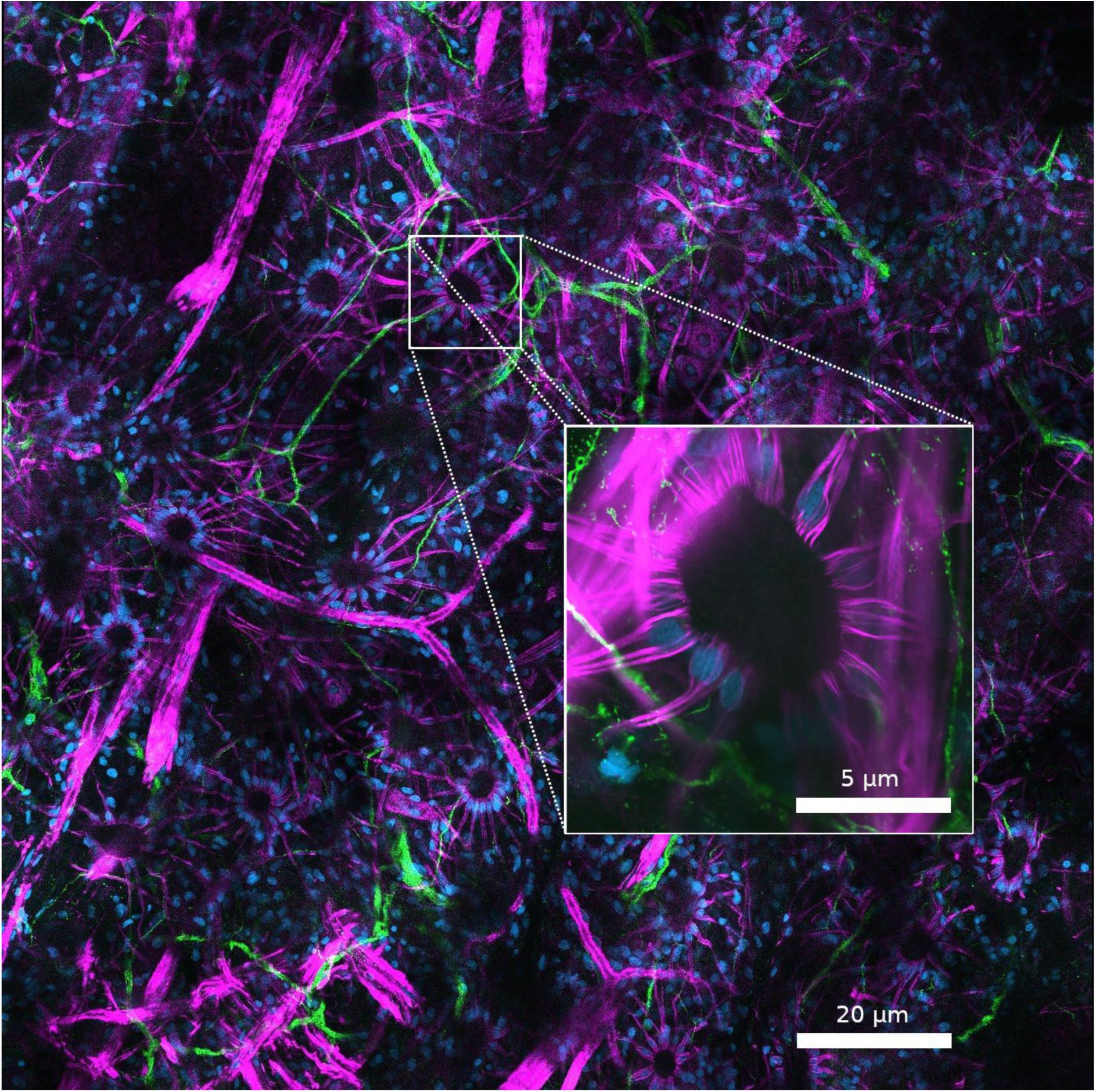 Confocal image of E. berryi’s stained skin captured with ZEISS LSM 980.