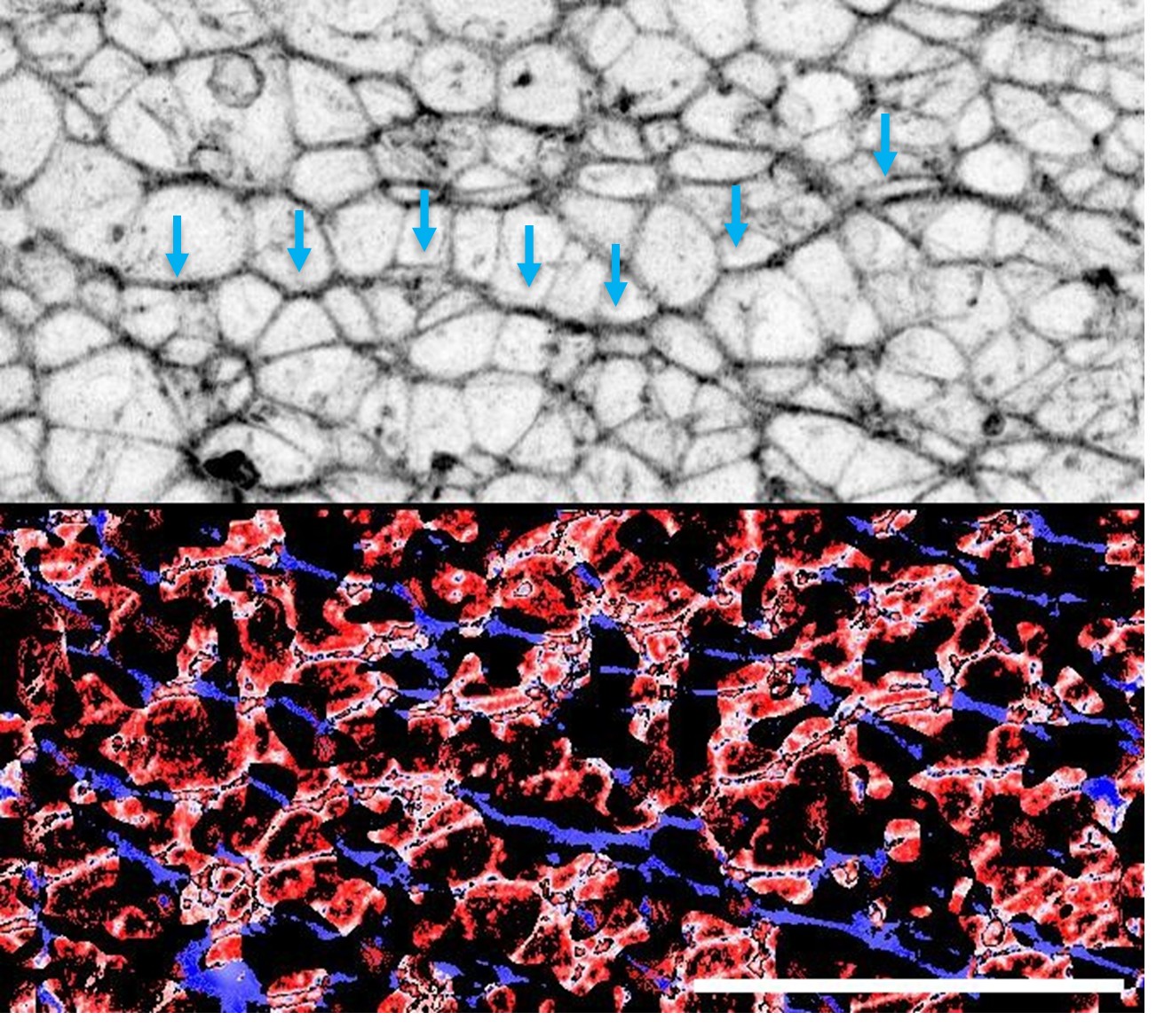 Preliminary identification of apical supracellular cables suggestive of local polarity. Top: F-actin staining shown in inverted grey LUT highlighting enrichment along directionally-polarised cell borders (blue arrows). Bottom: Staining orientation (blue ~ X axis, red ~ Y axis) based on OrientationJ analysis illustrating localised organisation of F-actin enrichment.
