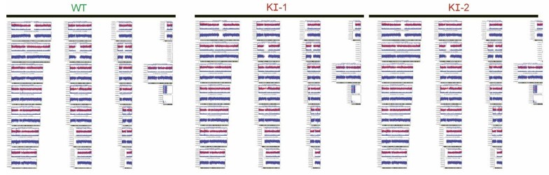 Snapshot of Illumina iScan SNP array showing absence of chromosomal duplications or deletions in the CRISPR-modified VANGL2-knockin lines or their congenic control.