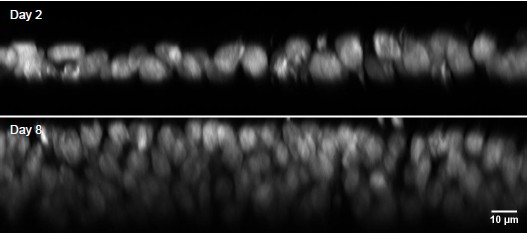 Lateral views of DAPI-stained nuclei on Days 2 and 8 of differentiation. Note the rapid loss of staining intensity below the apical pseudo-row of nuclei on Day 8. This intensity change is likely due to the apical nuclei being in G2/M phase and therefore having more DNA, and rapid loss of 405nm wavelength signal at depth.