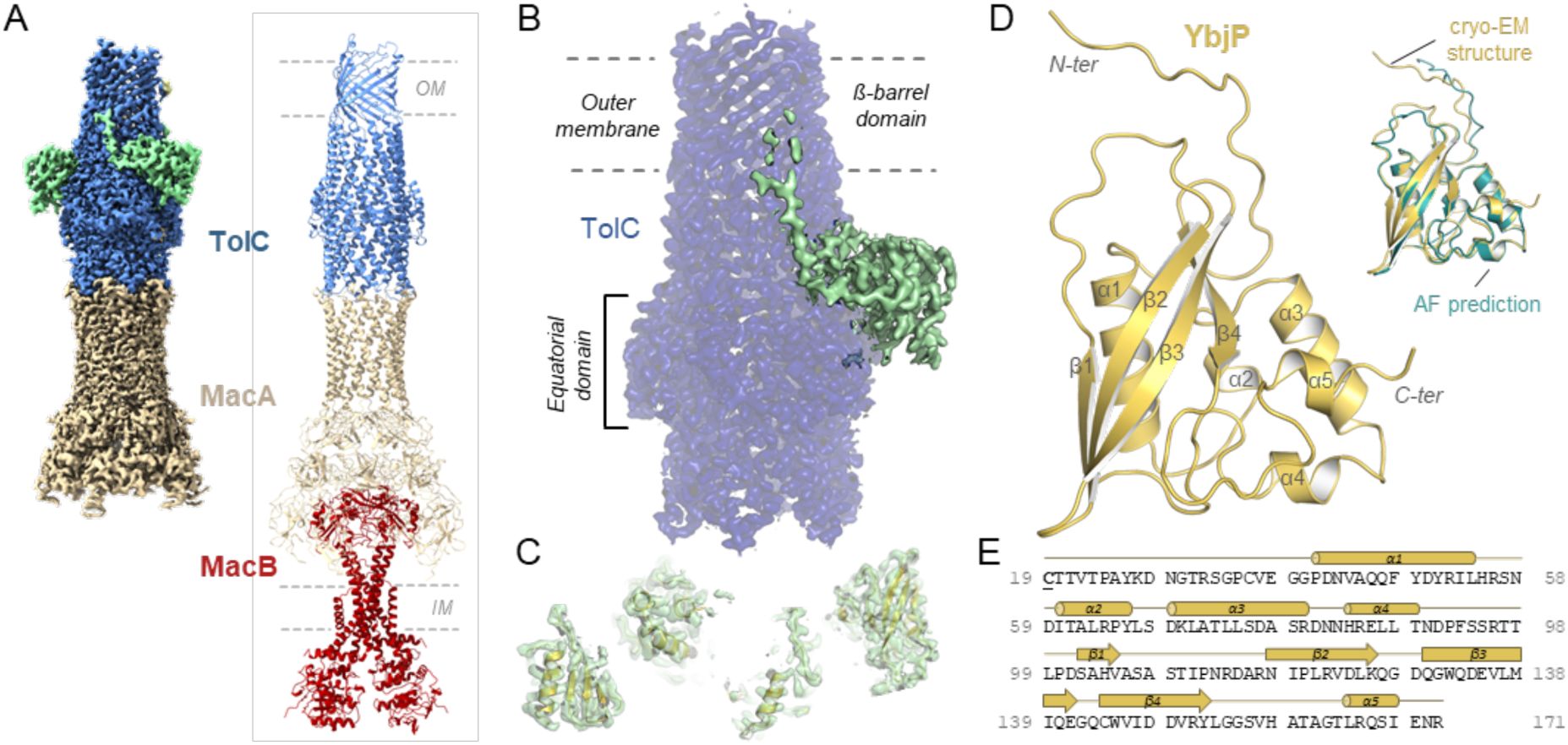 (A) Cryo-EM density map (left) and model (right) for the tripartite pump MacA-MacB-TolC (PDB 5NIL). Density for the MacB dimer is less well defined. (B) Close-up view on the TolC region showing additional density in green. TolC domain organisation is indicated. (C) Modelling of secondary structural elements fitting in the additional density. (D) The refined structure of the TolC partner, YbjP. After lipoprotein maturation, the N-terminal cysteine carries a lipid modification which is not shown here. Alignment of the YbjP structure from cryo-EM and corresponding AlphaFold prediction model is shown as inset. (E) Sequence and secondary structure alignment annotation of mature YbjP. The tri-acylated cysteine (C19) conserved in lipoproteins is underlined.