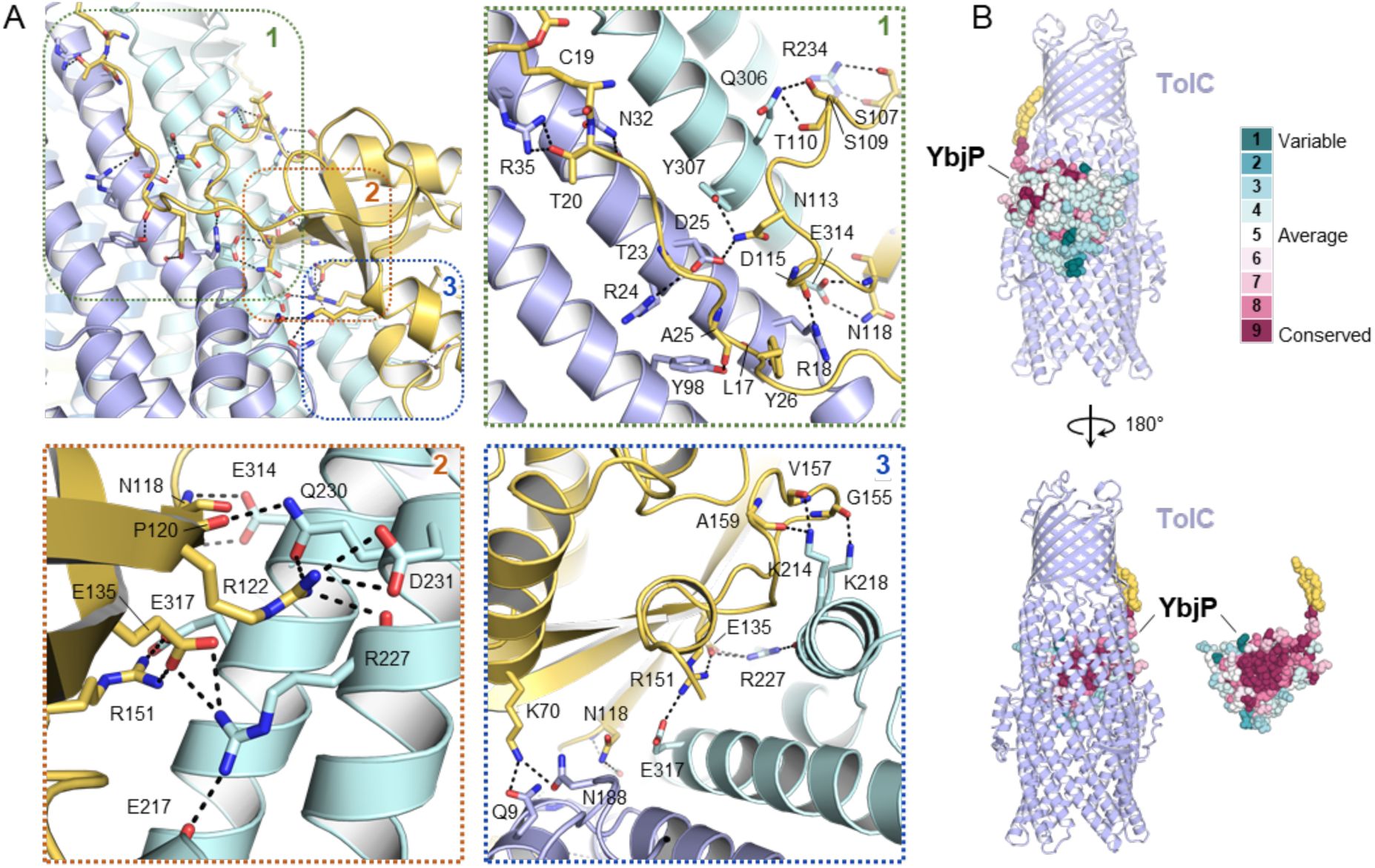 (A) Overview of protein-protein interactions with close-up views presented in panels 1, 2 and 3. The YbjP lipoprotein (yellow) contacts two adjacent protomers of the TolC trimer (blue). Lipoprotein acyl modification and residues involved in intermolecular contacts are shown in stick representation. (B) Residue variability analysis of YbjP highlighting the clustering of conserved residues at the TolC interface. Analysis was performed with the CONSURF server. YbjP is shown as spheres with the lipoylation in yellow.