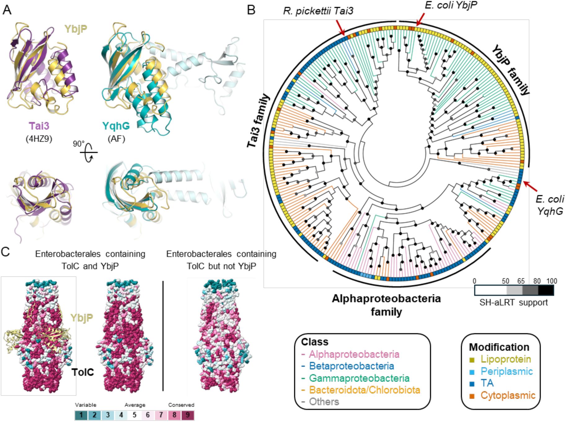 (A) Structural alignment of YbjP with other DUF3828-containing proteins: Tai3 (4HZ9, purple) and YqhG (AlphaFold Q46858, blue). A 90° rotation along the x-axis is shown underneath. (B) A cladogram of DUF3828-containing proteins. The reviewed proteins (Tai3, YbjP and YqhG) are marked by an arrow. (C) Surface conservation of TolC proteins from Enterobacterales containing or not YbjP. Results are displayed on E. coli TolC on the left and on P. atrosepticum TolC (AlphaFold model, Q6DAC5) on the right. For clarity, YbjP is displayed on the left panel but not on the right. Analysis was performed with the CONSURF server.