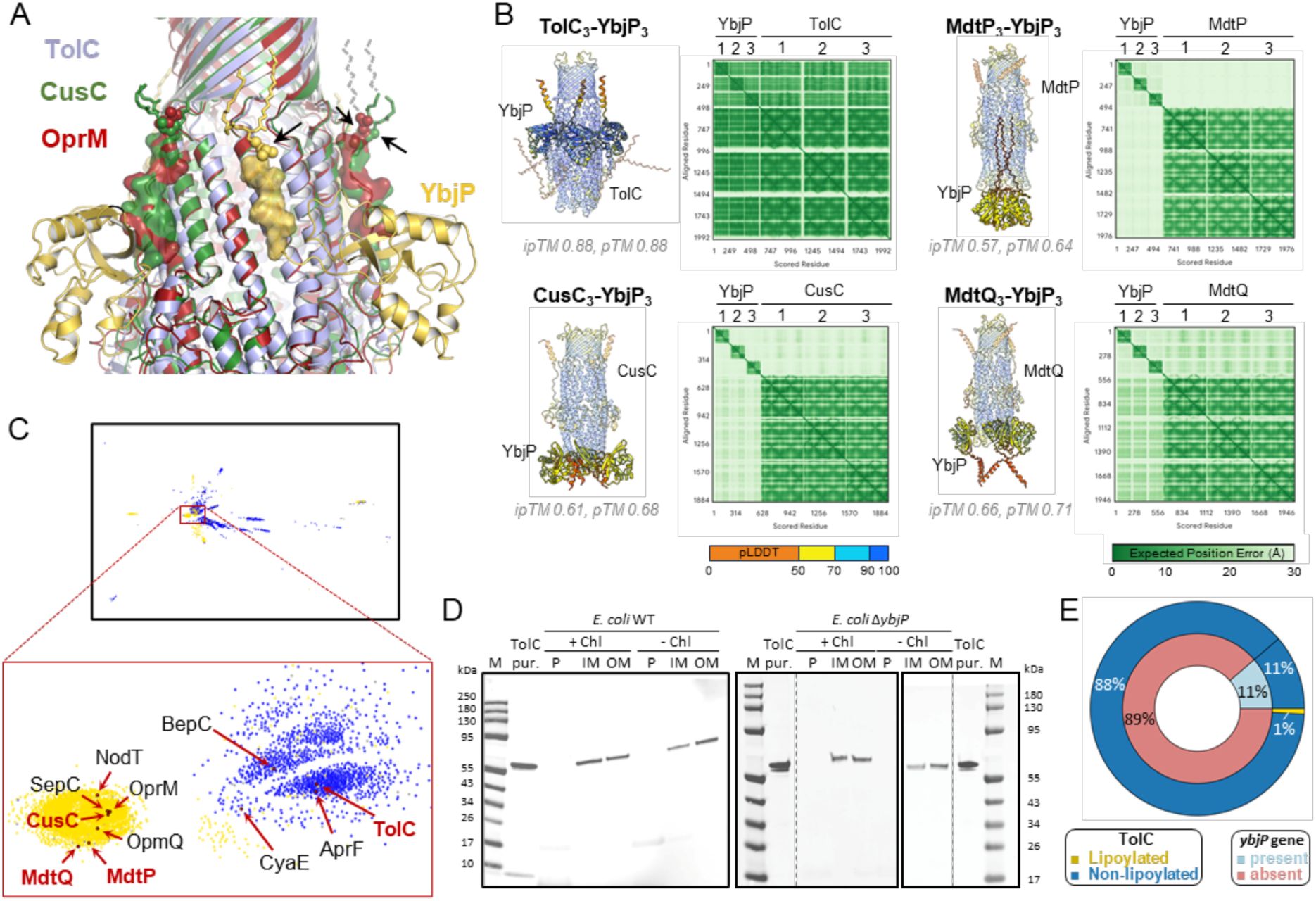 (A) Structural alignment of E. coli TolC (blue), CusC (3PIK, green) and P. aeruginosa OprM (3D5K, red). The YbjP or TolC-homologue linker is shown as transparent surface and modified cysteines are indicated by an arrow. Dashes lines show the extension of the lipid group (partially-or non-modelled in the structures). (B) AlphaFold3 prediction (Abramson et al., 2024) between E. coli outer membrane efflux proteins and YbjP. The model with the higher ipTM and pTM scores is shown out of three technical repeats. (B) CLANS analysis of outer membrane efflux proteins (IPR003423) in Pseudomonadota. Clustering was performed in 2D until equilibrium. Outer membrane proteins in E. coli are shown in red, and other key reviewed proteins in black. Yellow, lipoylation; blue, secreted; grey, other. (D) Immunoblot showing the localization of TolC in E. coli wild-type or ΔybjP cultured (+) or not in the presence of chloramphenicol (Chl). Cells were lysed and membranes separated on a sucrose gradient. Periplasmic fractions were obtained from spheroplast preparation as described in the Methods. Samples corresponding to the periplasmic fraction (P), the inner (IM) or the outer (OM) membranes were subjected to immunoblotting using anti-TolC antibodies. Purified (pur.) TolC protein served as control for the antisera. (E) Distribution of the ybjP gene and lipoylated TolC in Gammaproteobacteria. Repartitions are as follows: ybjP present (light blue, n=67) or absent (magenta, n=525); lipoylated (yellow, n=5) or non-lipoylated TolC (dark blue, n=587).