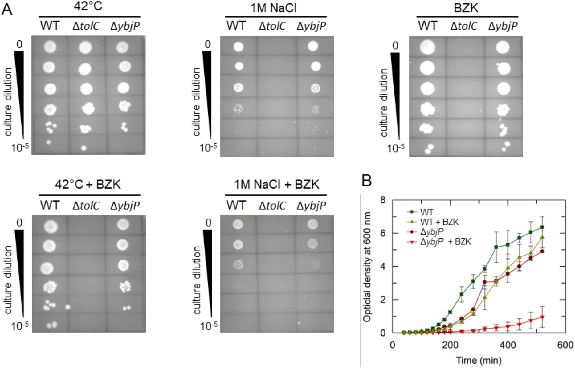(A) Dilution series on nutrient agar plates at 42°C temperature (left), in the presence of high salt concentration (1M NaCl, middle) or sublethal amounts of benzalkonium chloride (BZK, 10 μg mL-1, right). Plates combining grown at 42°C (left) or with 1M NaCl (right) and presence of BZK at the same concentration are displayed underneath. (B) Growth curves of WT and YbjP null strains in the absence or presence of 10 μg mL-1 benzalkonium chloride. Curves depict the mean ± standard deviation for two independent cultures.