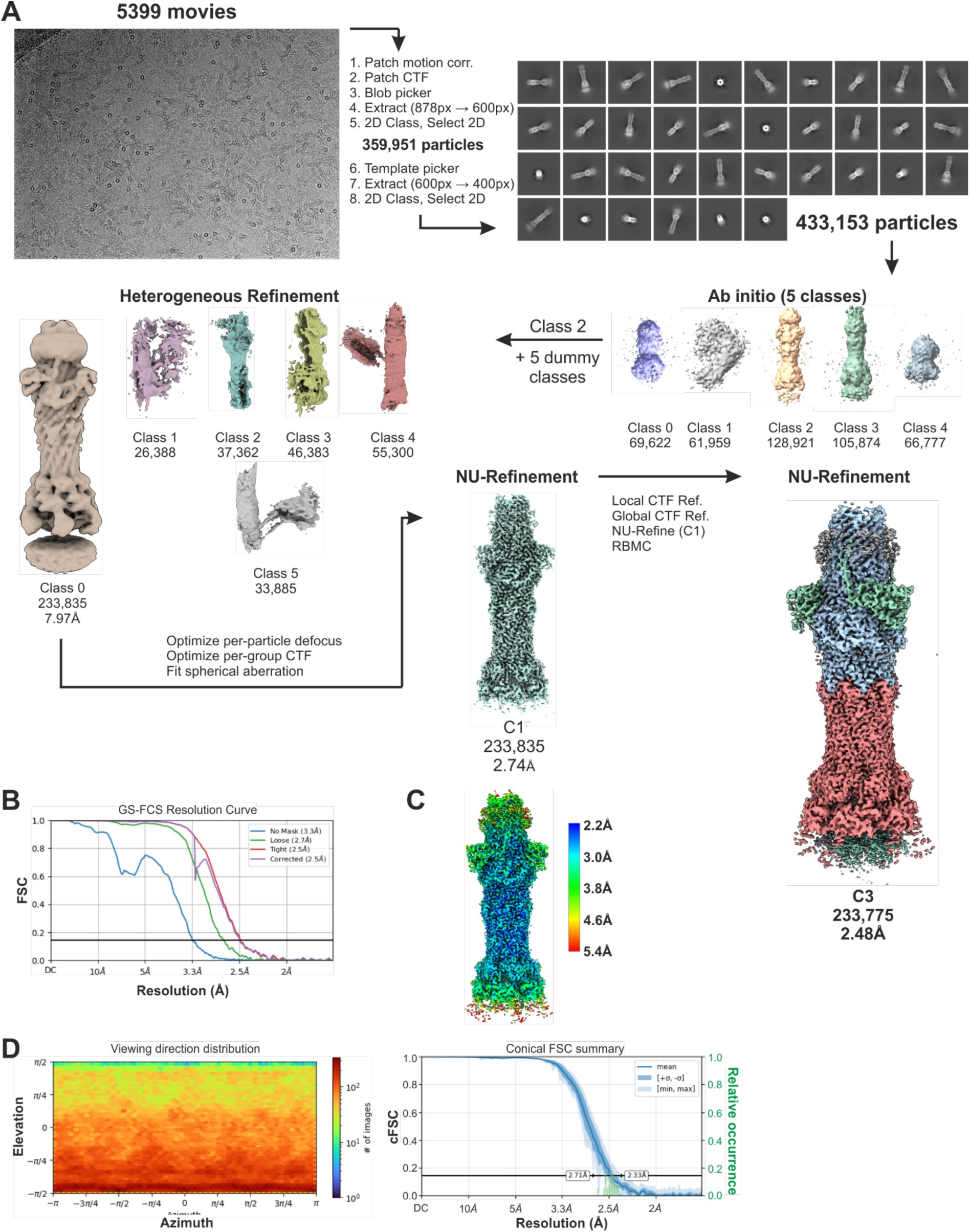 (A) Cryo-EM processing workflow. (B) Gold-standard Fourier Shell Correlation (GS-FSC) curves for final reconstruction. (C) Local resolution distribution in final map. (D) Angular distribution plot for final map, left, and Fourier Shell Correlation between half maps of MacAB-TolC-YbjP, right. These data suggest that there is not a large orientational bias in the final map.