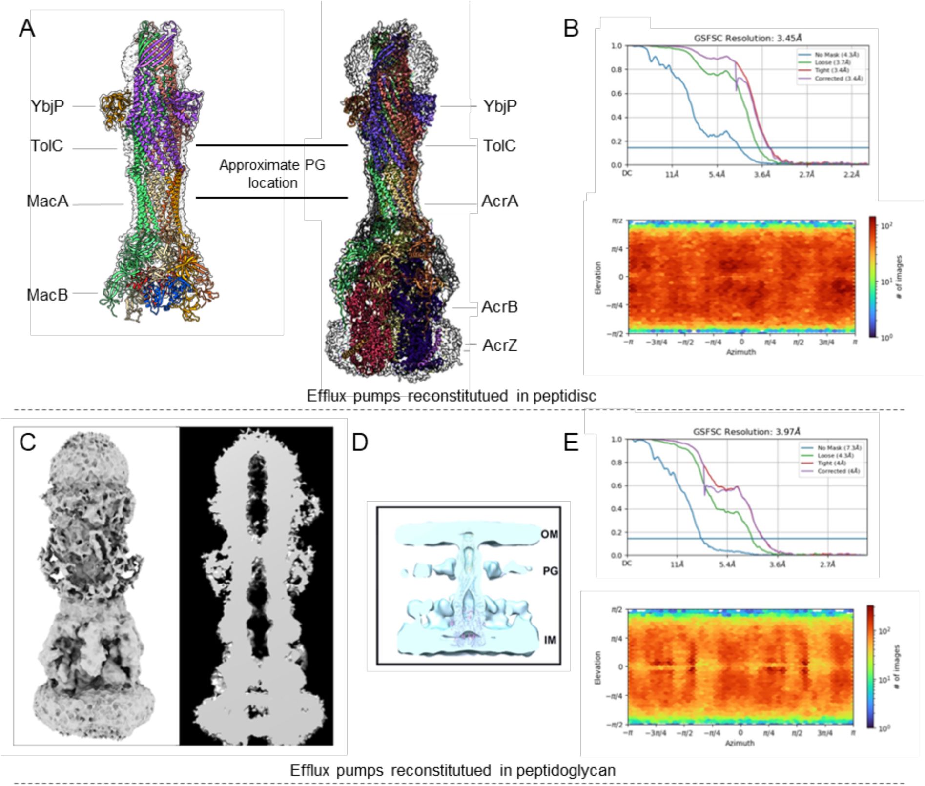 (A) Cryo-EM maps and models of MacAB-TolC-YbjP and AcrABZ-TolC-YbjP reconstituted in peptidisc. (B) Fourier shell correlation between half-maps (top) and angular distribution of the particles (bottom) for the AcrABZ-TolC-YbjP dataset. (C) Cryo-EM map of AcrABZ-TolC-YbjP reconstituted in peptidoglycan. (D) Peptidoglycan location based on the cryo-ET map described by Shi et al., 2019. A similar location was reported by Gumbert et al., 2020. (E) Fourier Shell Correlation between half-maps (top) and angular distribution plot of the particles (bottom). Collection statistics for the AcrABZ-TolC-YbjP complex reconstituted in peptidisc and in peptidoglycan are listed in Supplementary Table S2.
